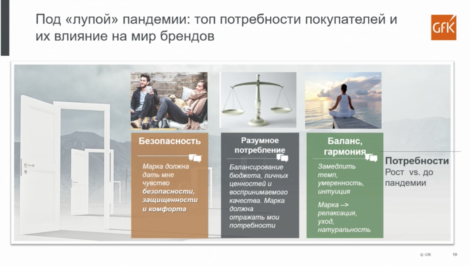 Виходячи зі свого досвіду, дослідники виділили топ-3 факторів, які визначають, як поводяться споживачі. На першому місці – це безпека, пошук безпеки. Коронавірус допоміг цьому тренду вийти на першу позицію, але він існував і раніше.
