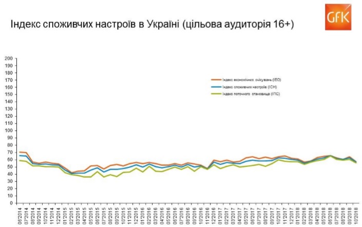 «У жовтні індекс споживчих настроїв зменшився до рівня початку 2018 року. Найбільшого падіння зазнав індекс очікувань розвитку економіки у найближчому році, що позначилось на зниженні індексу доцільності робити великі покупки. Водночас споживачі відкоригували девальваційні очікування: індекс очікувань девальвації зменшився після різкого росту у серпні-вересні», ─ коментують аналітики GfK Ukraine.