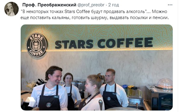 Кабаєва в кокошнику, алкоголь в меню (і це не жарт), “вкусное кофе” на офіційному сайті та “скрєпи”, – з якими жартами користувачі зустріли мережу кав’ярень Stars Coffee, що почали відкриватися в росії на місці Starbucks.