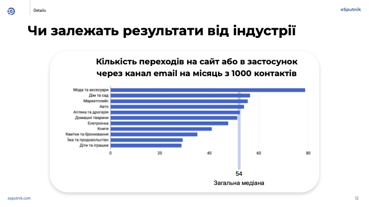 Середній показник переходів на сайт чи в застосунок через e-mail-канал становить 54%. За останній рік деякі галузі зробили справжній прорив у розвитку прямої комунікації з клієнтом. Наприклад, суттєво покращили свої показники аптеки та drogerie-мережі.