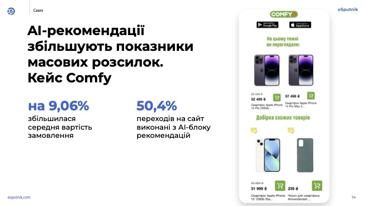 Перший кейс, який ми реалізували з Comfy, показує, як можна покращити показники масових розсилок. Зазвичай ритейлери роблять масову розсилку на всю базу чи відповідно до певної сегментації. Але зазвичай такі розсилки містять стандартні товарні рекомендації. Ми змінили цю практику і минулого року запустили новий функціонал, який дозволяє персоналізувати товарні рекомендації. Це може бути товар з будь-якої категорії ритейлера. В результаті на 9% збільшилась середня вартість замовлення і на 50% кількість переходів на сайт.