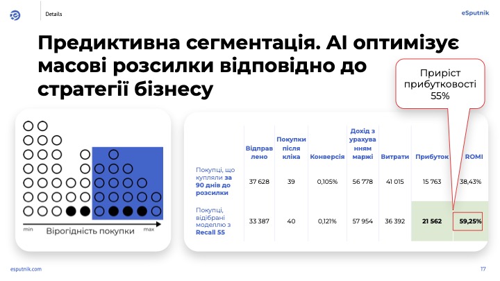 Viber та SMS – досить дорогі канали для комунікації з клієнтами, тому ми розробили рішення, яка досліджує вірогідність, з якою клієнт може здійснити покупку. Якщо вірогідність досить низька, то ритейлер може не витрачати кошти на комунікацію з ним через ці канали. Такий підхід значно покращує показник return of marketing investment (ROMI). В результаті розсилка здійснюється тільки на ту базу клієнтів, які готові купувати й відповідно рентабельність комунікації стає значно вищою.