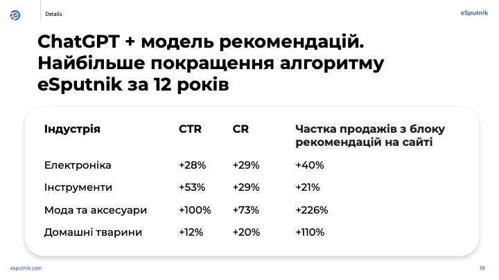 Крім того, ми розробили нову модель створення товарних рекомендацій, яка працює із залученням Chat GPT та Large language Models. В результаті ми отримали значний приріст показників переходів через рекомендації на сайт та продажів у різних сферах ритейлу. Наприклад, у галузі моди та аксесуарів рекомендації стали генерувати вдвічі більше продажів.