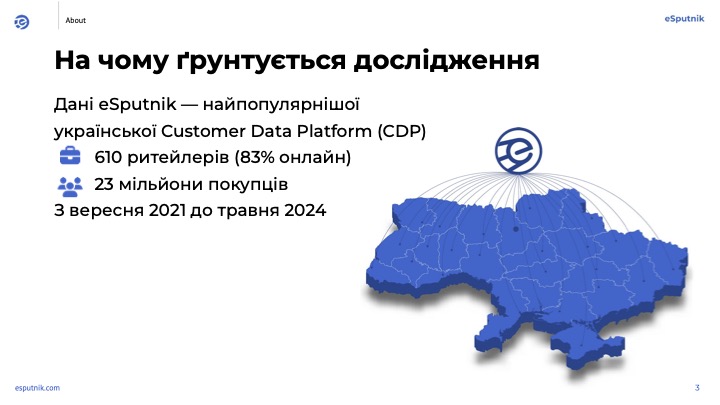Цього року ми досліджували тенденції та працюючі стратегії на основі вивчення даних eSputnik, а це це 610 ритейлерів (83% онлайн), які мають загальну кількість покупців 23 млн. Для визначення змін, які відбулися у сфері української електронної комерції, ми відштовхувались від показників з вересня 2021 до травня 2024.