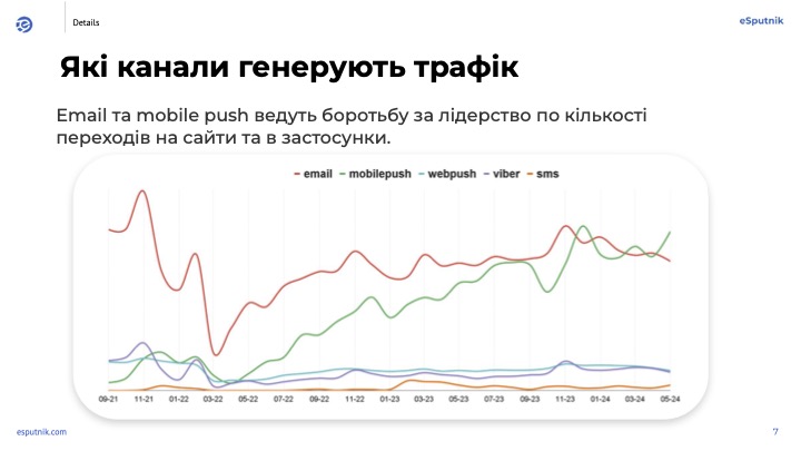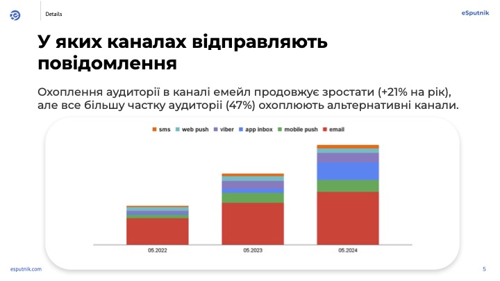 Історично, основним каналом для ритейлу був e-mail. Зараз цей канал продовжує зростати. Інші канали займають 50% і відіграють важливу роль у розвитку електронної комерції. Але відповідно до даних Open Rate у Viber, у mobile push статистика відкриття повідомлень значно вища, ніж в електронних листів.