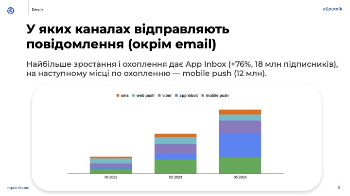 Гарний ріст також показують App Inbox (центр сповіщень у мобільному телефоні), mobile push, Viber та SMS.