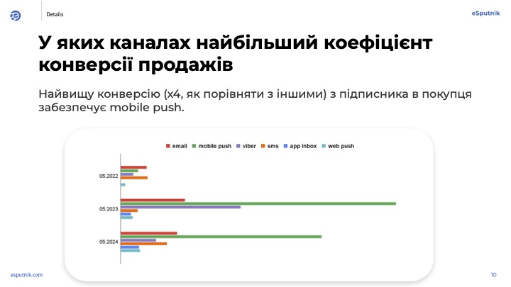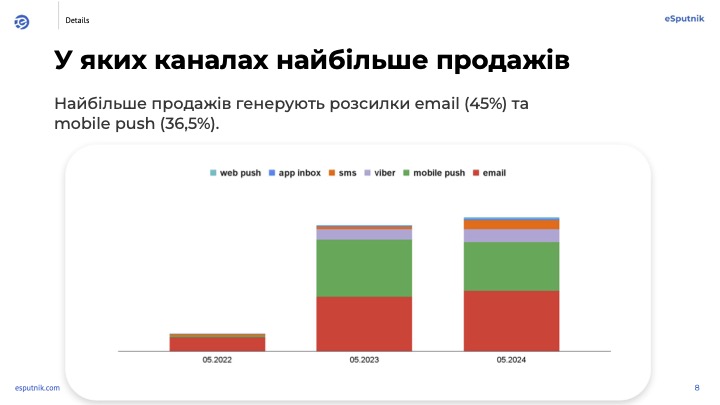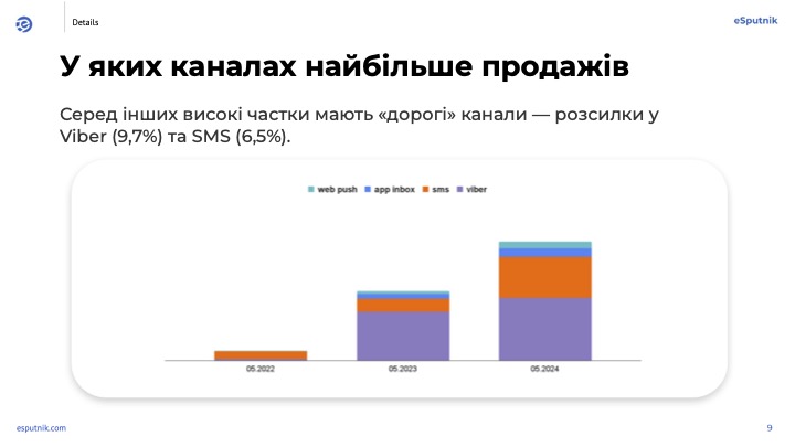 До каналів, які генерують високі продажі, також відносяться електронні листи та мобільні push-повідомлення. Гарні результати також показують такі дорогі канали як Viber-розсилки та SMS.