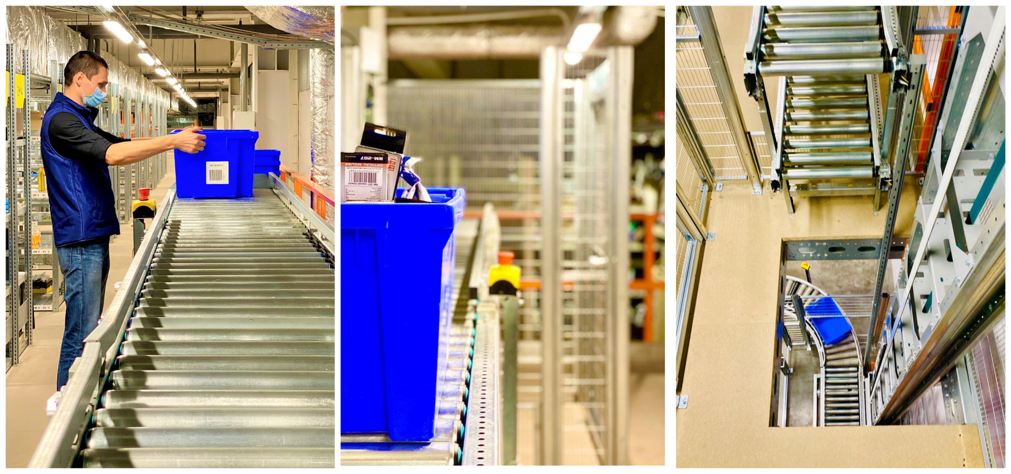 Зібравши замовлення за допомогою сканера комірник спускає його на перший поверх касирам. На допомогу йому у цьому приходить роботизований конвеєр, який піднімає товари на другий поверх для зберігання, та спускає вже готові замовлення на перший поверх у зону видачі.