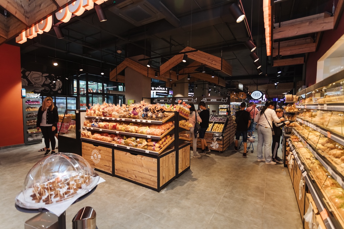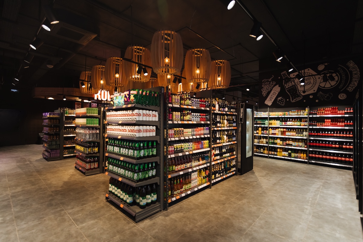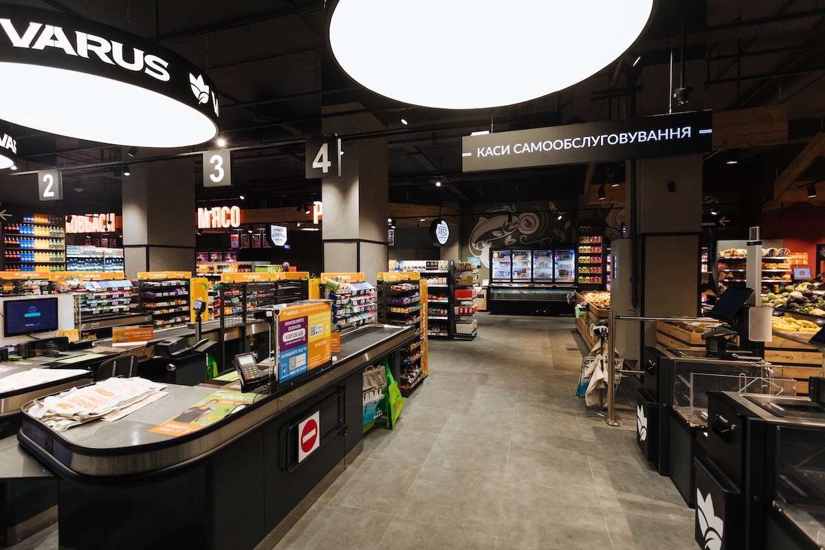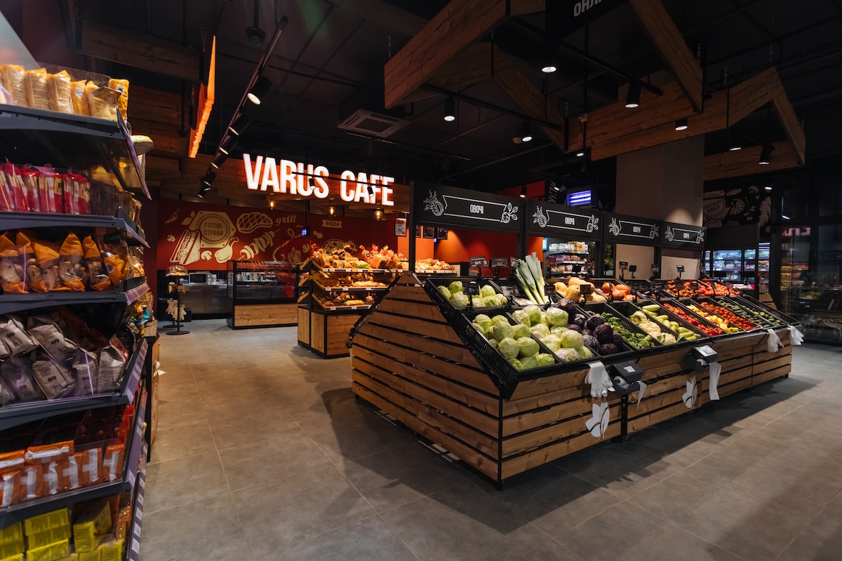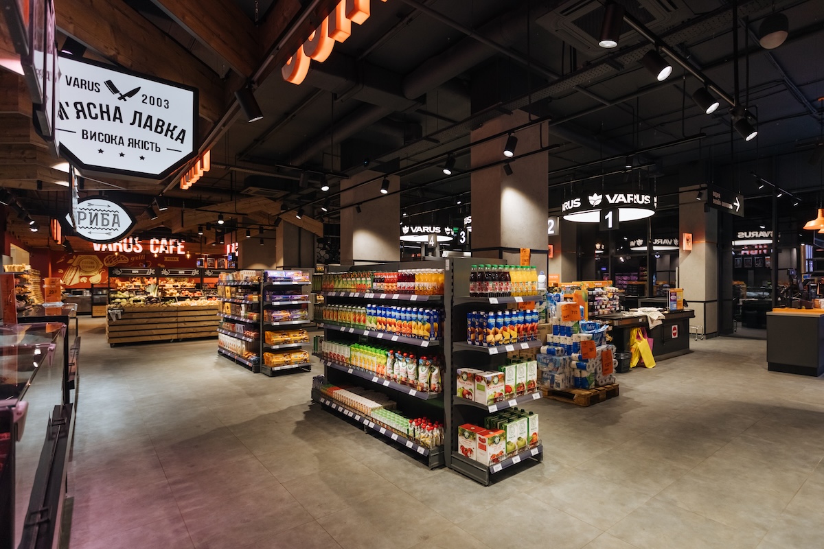 Солодощі представлені у затишній зоні з теплим освітленням, винний відділ прикрашений ліхтарями у формі бочок, а молочний та пивний відділи мають символічні конструкції у вигляді бідонів та кегів. Супермаркет Varus має унікальний дизайн: відділи підсвічені неоновими вивісками, а на стінах розміщені стильні векторні принти.