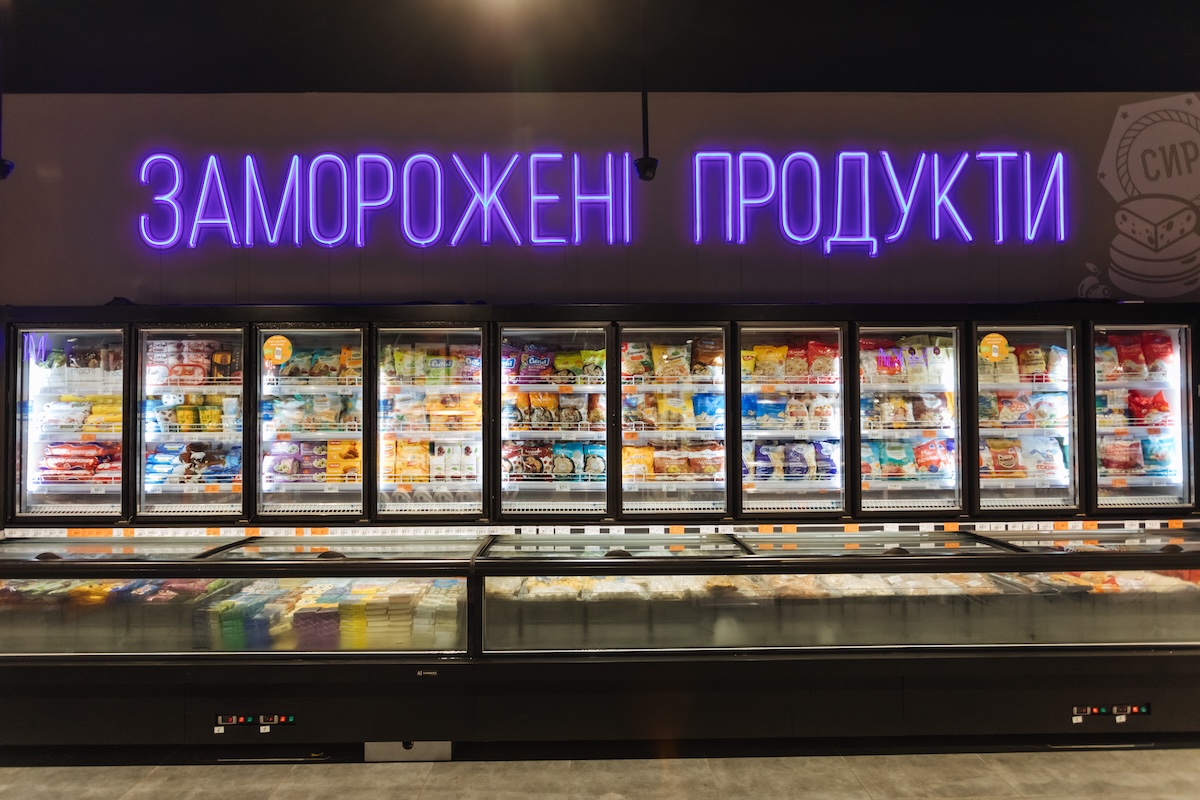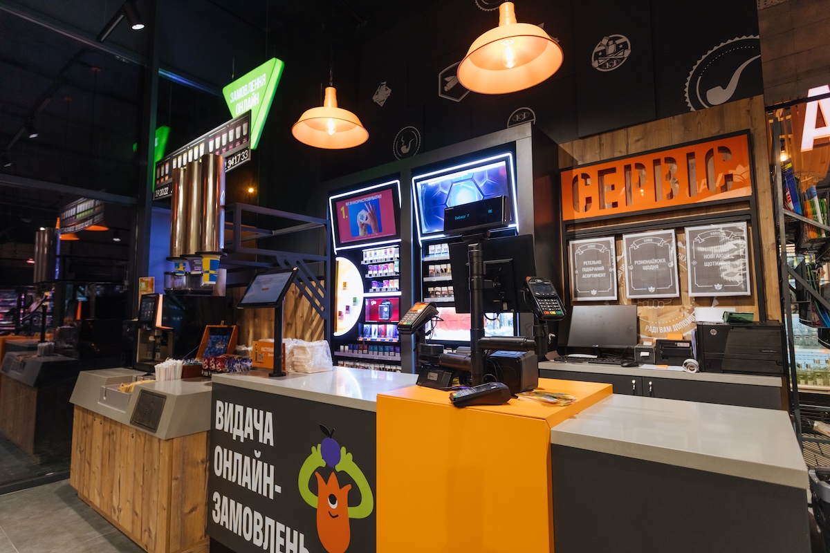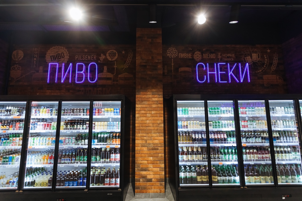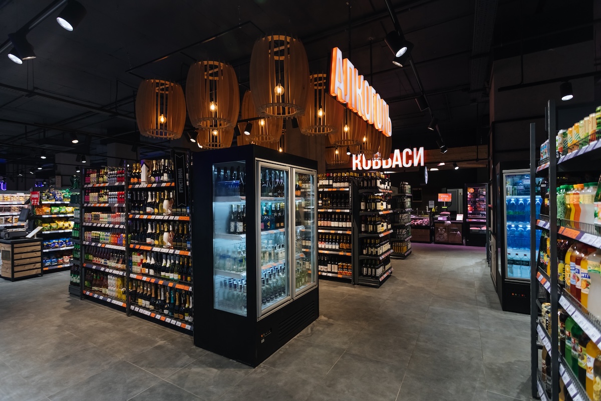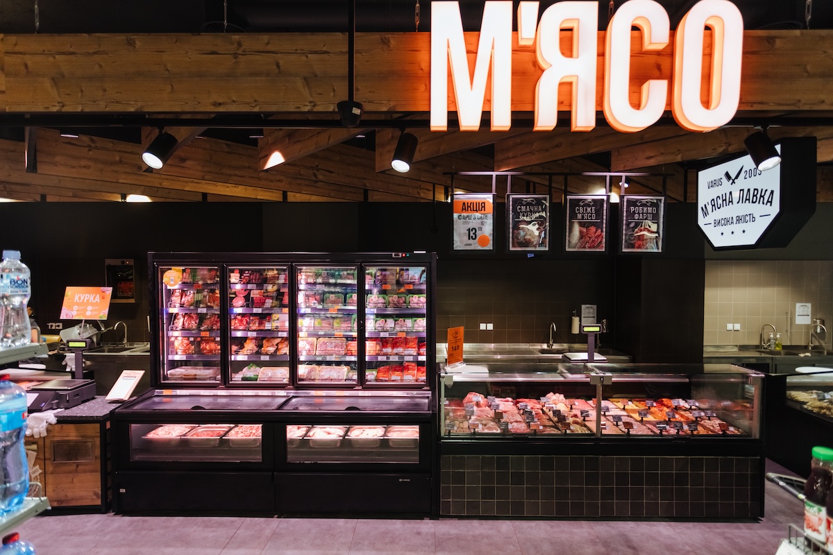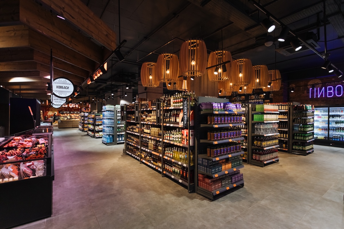 Солодощі представлені у затишній зоні з теплим освітленням, винний відділ прикрашений ліхтарями у формі бочок, а молочний та пивний відділи мають символічні конструкції у вигляді бідонів та кегів. Супермаркет Varus має унікальний дизайн: відділи підсвічені неоновими вивісками, а на стінах розміщені стильні векторні принти.