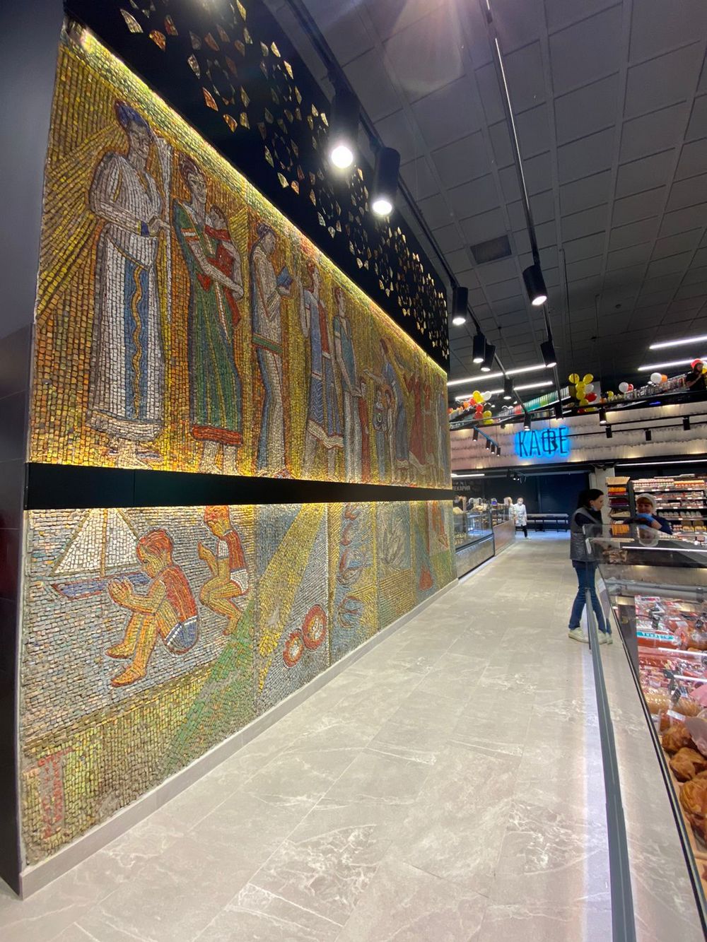 Дизайнерам мережі Семья довелося пофантазувати, аби все це знайшло місце в будівлі супермаркету. А ще було надважливо зберегти шарм колишньої торгівельної мекки міста – універсаму «Артемівськ». Окраса будівлі – панно 1981 року невідомого автора всередині. Історичну мозаїку зберегли, і вона напрочуд добре вписалася у сучасний дизайн. Її реставрували та доповнили підсвіченою перфорованою панеллю з геометричним орнаментом троянд, що нині є символом міста.