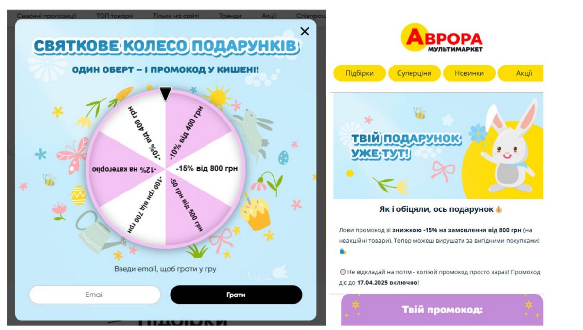 Мережа Аврора мала на меті створити радісну весняну атмосферу перед Великоднем і запустила інтерактивну гру. З 14 по 16 квітня 2025 року на сайті Avrora.ua проходила гейміфікована акція «Святкове колесо подарунків». Кампанія стала не тільки потужним інструментом залучення, а й створила справжній настрій напередодні Великодня. Атмосферні й милі креативи, весняний настрій, прості правила участі та приємні подарунки — усе це зробило кампанію не лише ефективною, а й емоційною.