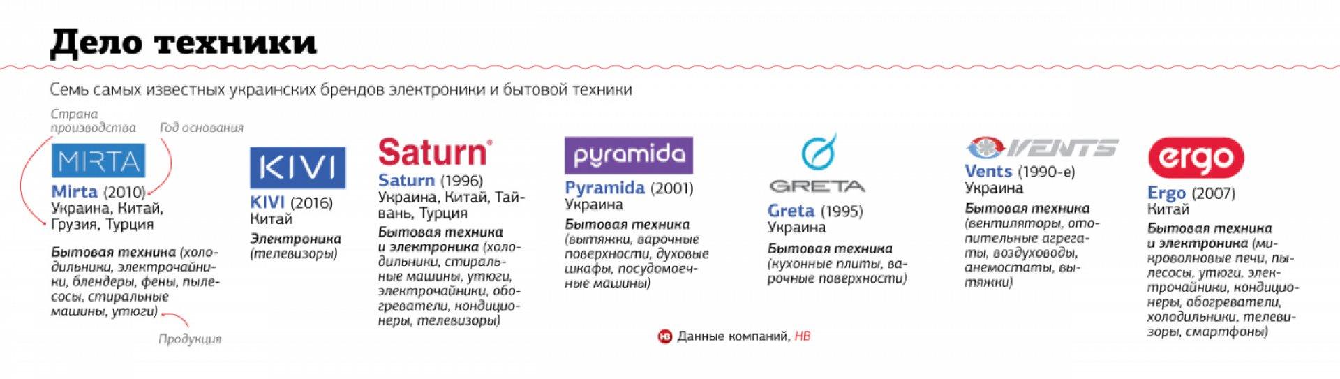 В країні успішно продаються ще з десяток місцевих брендів, що ховаються під “імпортними” назвами і, як правило, розміщують замовлення на виробництво в Китаї. Так, велику і дрібну побутову техніку роблять Mirta, Saturn і Prime, витяжки — Pyramida, електро – та газові плити — Greta, обігрівачі — Atlantic і Stinex, вентилятори — Vents.