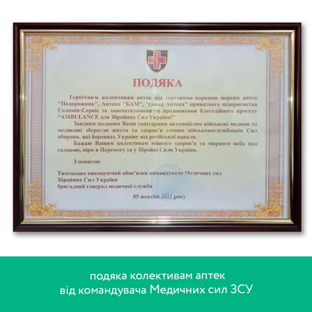 У жовтні колектив аптек отримав подяку за започатковування й продовження проєкту «AMBULANCE для ЗСУ» та допомогу військовим медикам та медикиням, а власника компанії Олександра Федечко було відзначено іменною нагородою від в.о. командувача Медичних сил ЗСУ.