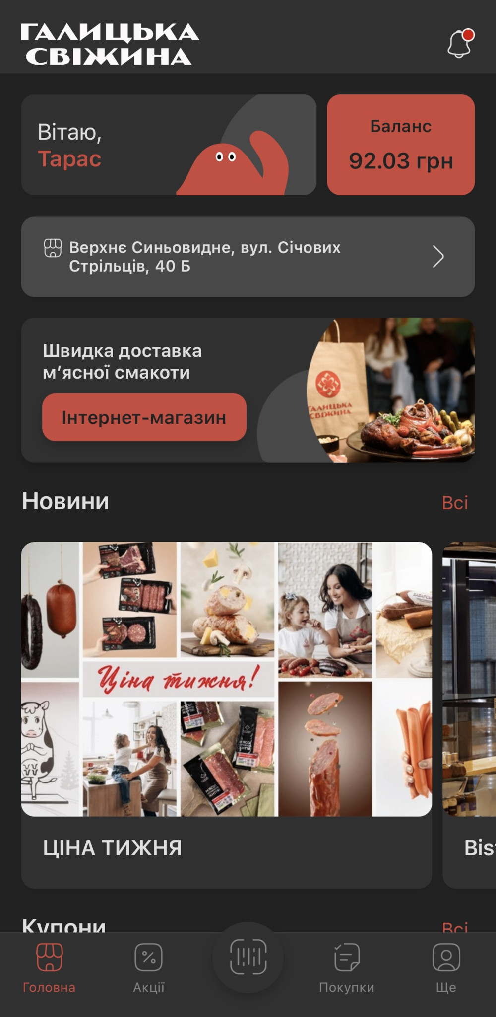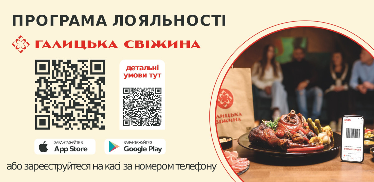 Програма лояльності Галицька Свіжина створена для того, щоб зробити кожну покупку вигідною та зручною для наших клієнтів. Реєстрація доволі проста: достатньо завантажити мобільний застосунок та за кілька хвилин зареєструватися, чи це можна зробити за номером телефону на касі. Мобільний застосунок зберігає всі транзакції та бонуси для зручного контролю витрат і покупок.