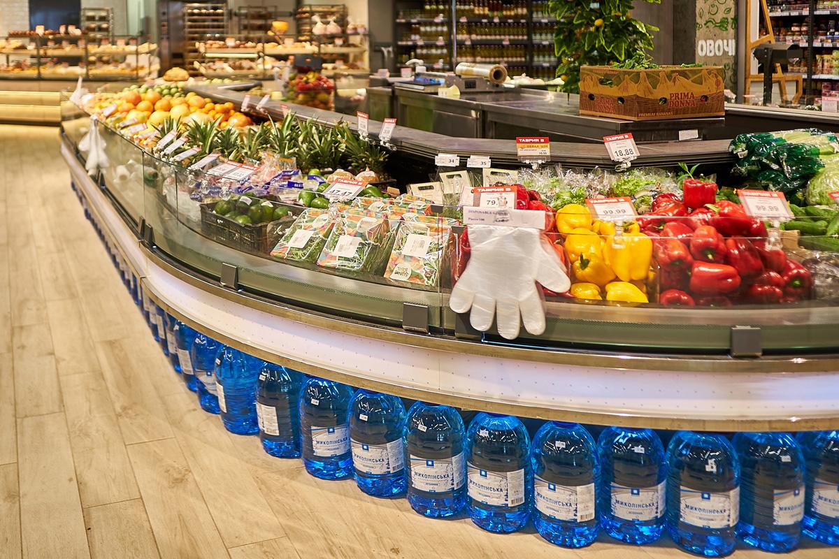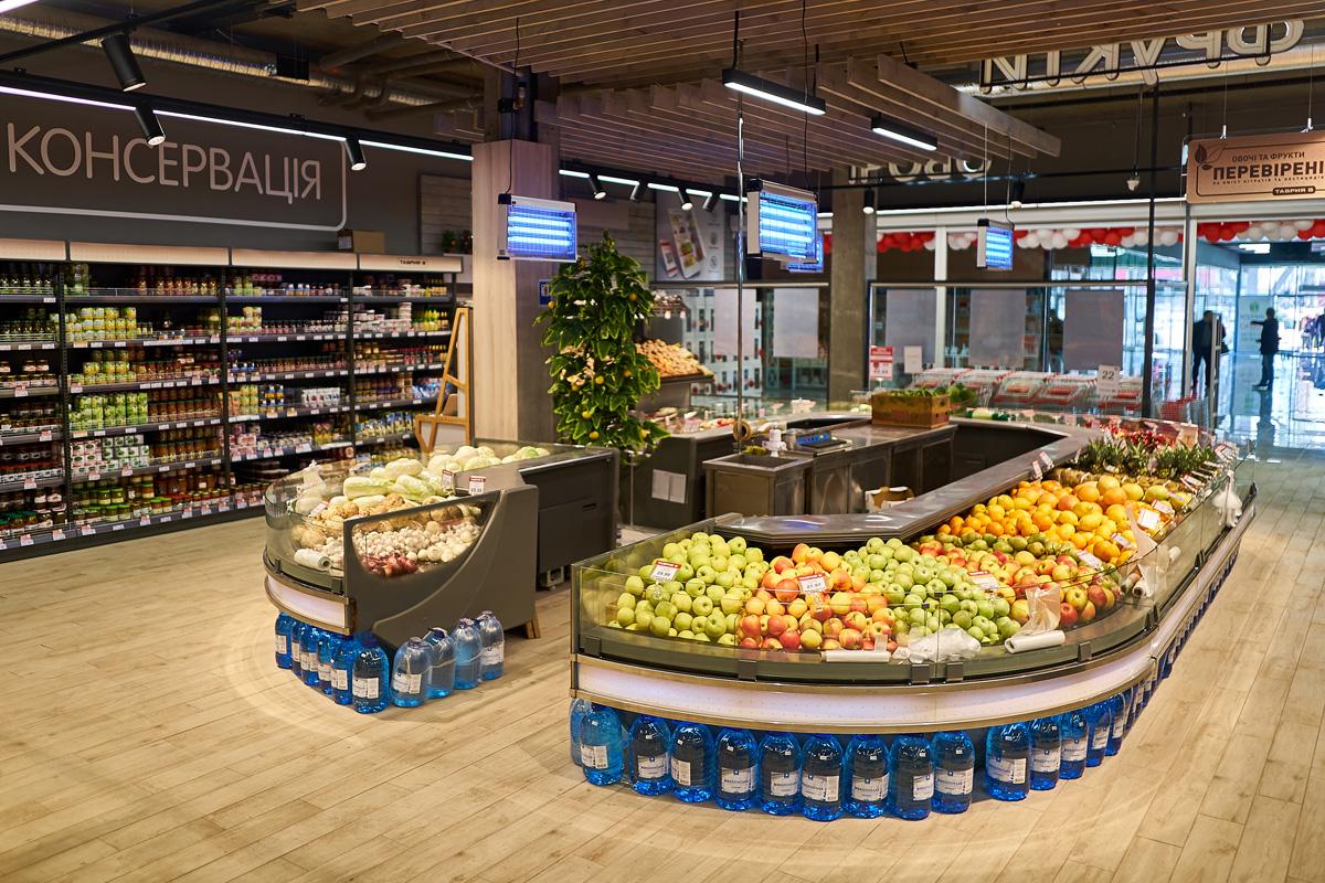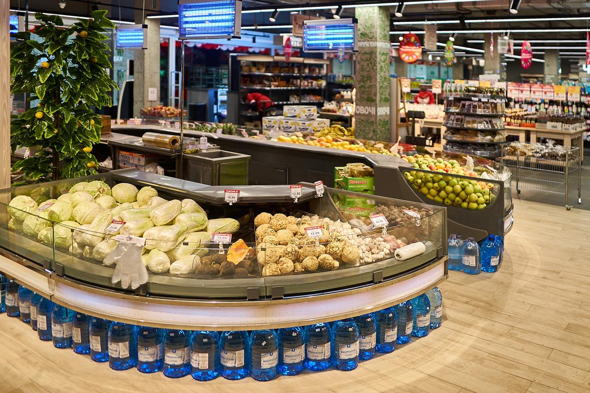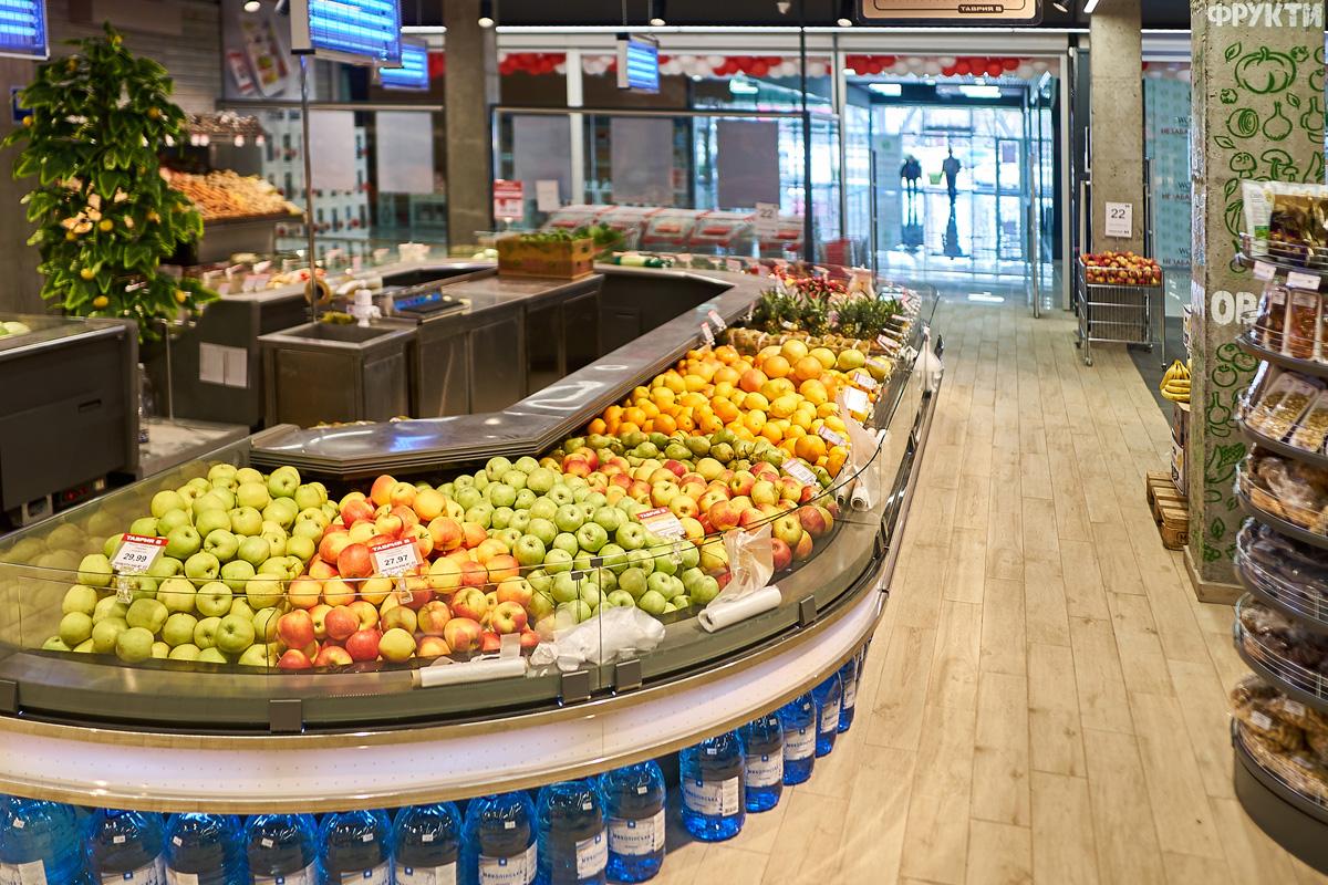 Другим акцентом експозиції в супермаркеті стала зона продажу зелені, овочів і фруктів. Ефективна фреш-зона обладнана островом холодильних вітрин. Широка охолоджувана поверхня вітрин, радіусні кутові елементи і низьке скло забезпечують покупцям зручність вибору продуктів.