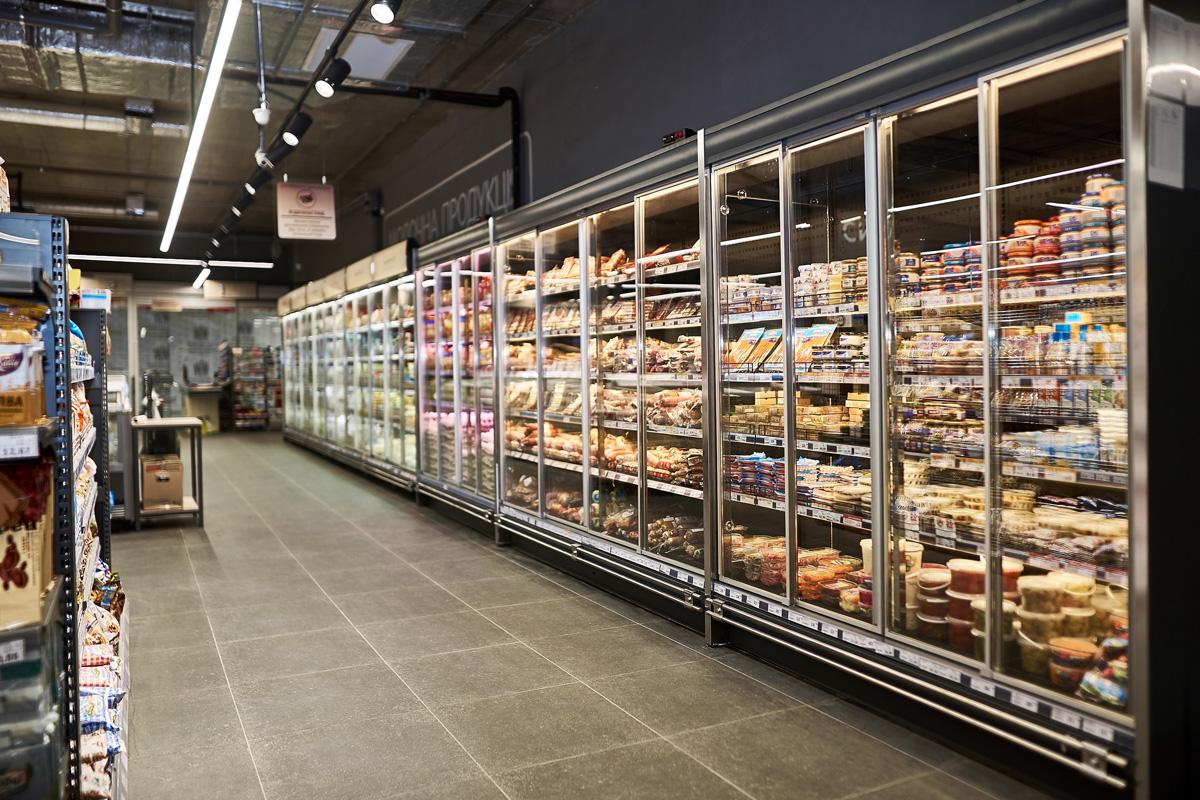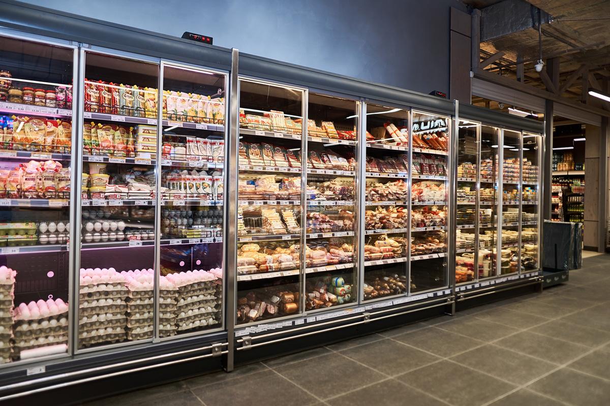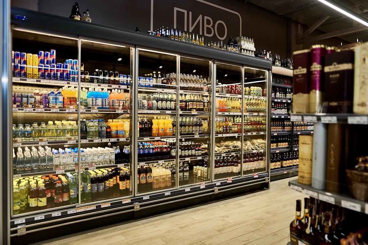 Пристінні вітрини з енергозберігаючими скляними дверима застосовані в торговому залі для продажу фасованої гастрономії, пресервів і напоїв. Лінія пристінних вітрин для молочної продукції додатково оснащена рекламними лайт-боксами.