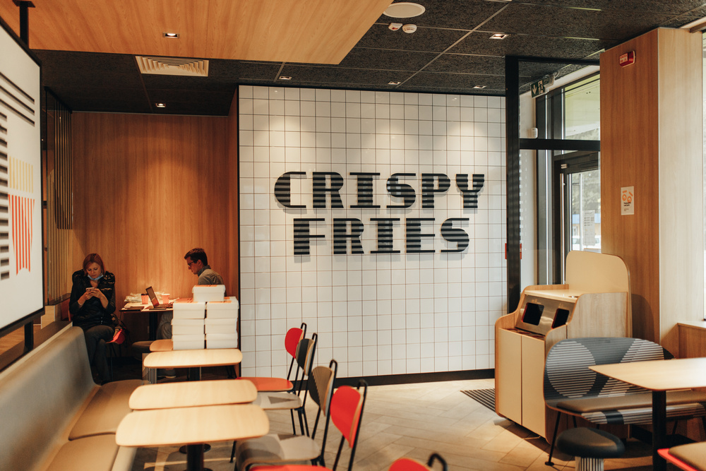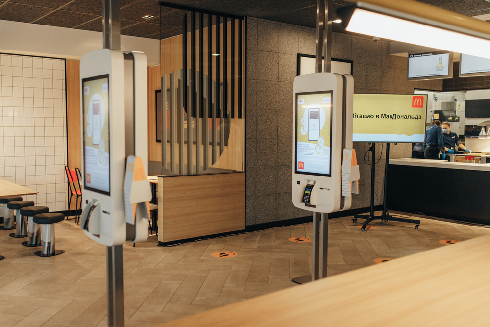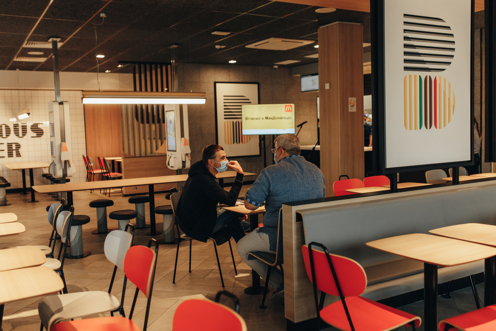 Зала оформлена у традиційному для McDonald’s еко-стилі з широким використанням природніх матеріалів, панорамними вікнами, зручними проходами та зрозумілою навігацією.