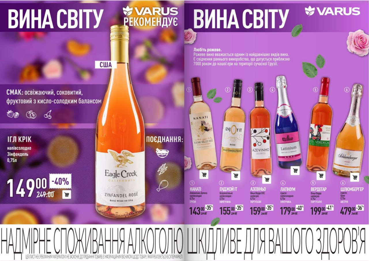 Нагадуємо, що спеціальні пропозиції на рожеві вина діятимуть по 17.07.24 у всіх магазинах Varus, а також при замовленні на varus.ua. Більш детальну інформацію можна переглянути за посиланням. Не пропустіть можливість скористатися вигідними пропозиціями та знижками на імпортні рожеві вина!