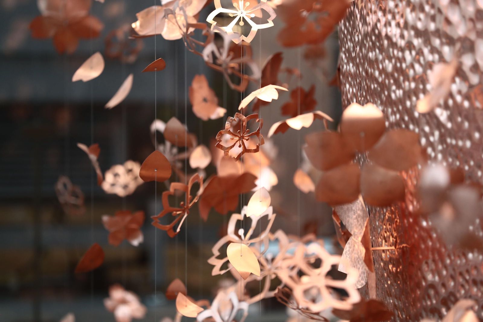 Головним дизайнером проекту традиційно для мережі стала Ліз Мюллер. В оформленні закладу вона використовувала породи світлого дерева, обробленого за традиційною японською технологією, і прикрасила стелю геометричної плиткою, нагадує орігамі. З інших прикрас – штучні квіти сакури ручної роботи, які оплітають 17-и метровий мідний бак. Залежно від світла протягом дня він змінює свої відтінки від блідо-рожевого до вишневого. Бак займає центральне місце в кав’ярні, і, по суті, став центром уваги: він проходить через всі чотири поверхи.