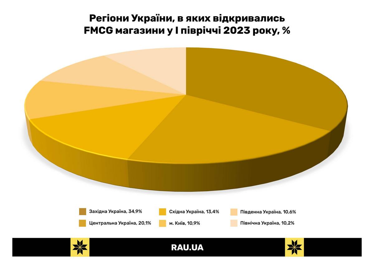 Якщо проаналізувати географічний розподіл нових локацій FMCG-рітейлерів, одразу видно орієнтацію за вектором: чим далі від фронту, тим більше нових магазинів. Так, за даними аналітиків GT Partners Ukraine, основна маса нових магазинів була відкрита на заході України – близько 34,9%. Що обумовлено як фактором відносної безпечності цих регіонів, так і різким збільшенням кількості споживачів за рахунок евакуйованих. Зазвичай це магазини невеликого формату, орієнтовані на жителів району навколо торгової точки. Яскравий приклад -магазини Сім23 та Сімі або Близенько. Проте у другому кварталі 2023 року проявився тренд на зменшення частки відкриттів на заході країни, де за результатами першого кварталу фіксувалося більше 36,4%. Натомість, при майже незмінній частці у центрі України (20,10%) кількість нових магазинів у східних областях збільшилася до 13,4% проти 10,9% у березні цього року. Так само поменшала частка нових магазинів у столиці (10,9% проти 11,8%) та на півночі країни, але додалося нових торгових точок у південних областях. Там частка нових магазинів у другому кварталі 2023-го трохи підросла із 10% до 10,6%. Загалом же у Києві, на півдня та півночі розподіл нових точок виглядає досить рівномірно на рівні 10-11%.