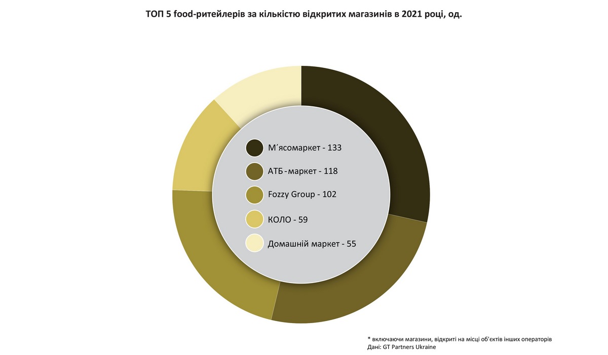 У порівнянні з аналогічним звітом річної давності відбулися істотні зміни й за темпами зростання різних мереж. Так, в топ-5 мереж FMCG за темпами розширення змінився оператор-лідер за кількістю нових магазинів, відкритих за січень-грудень 2021 року. Якщо у 2020-му лідером за кількістю відкритих торгових точок була мережа АТБ з показником у 127 нових магазинів, то у 2021 році вона зайняла лише другу позицію (118). Тепер лідером став відносно молодий оператор М’ясомаркет (Київ), що відкрив 133 торгові точки. Таким чином за рік мережа, яку розвиває агрохолдинг МХП, збільшилася у розмірах майже вчетверо: з 52-х до 180-ти торгових точок.