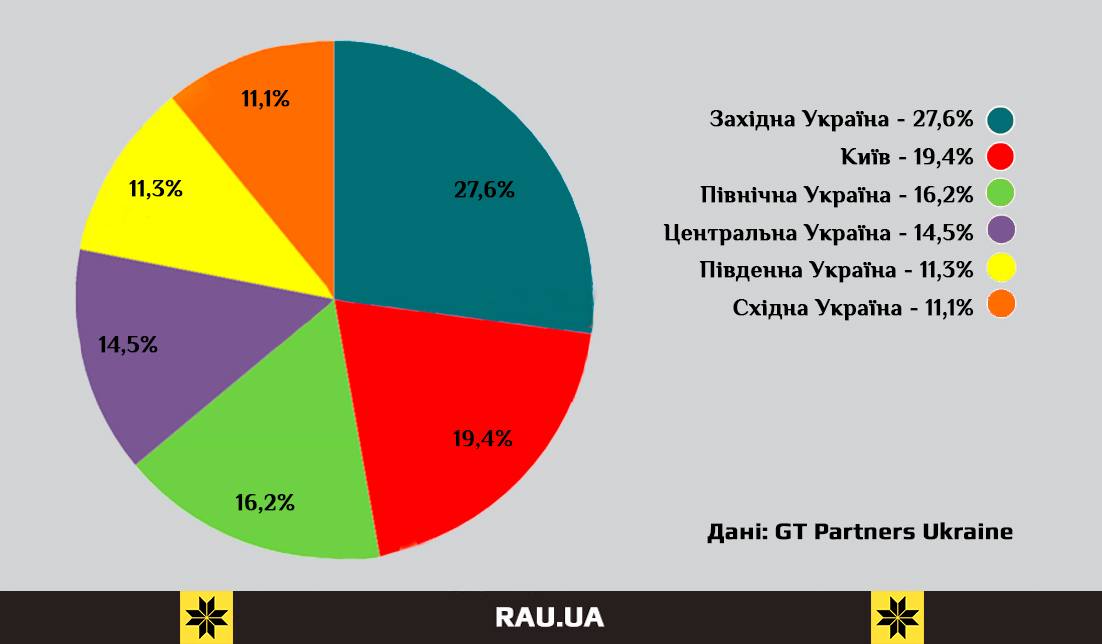 У регіональному розрізі, як і рік тому, рітейлери найбільше відкривали нові магазини на Західній Україні та в столиці. Власне всі три мережі новачки у топ-10 якраз і представляють ці регіони. Так, у Волинській, Рівненській, Тернопільській, Львівській, Івано-Франківській, Хмельницькій, Чернівецькій, Закарпатській областях відбулась майже третина запусків нових торгових точок. На Київ та його околиці прийшлося майже 20%.