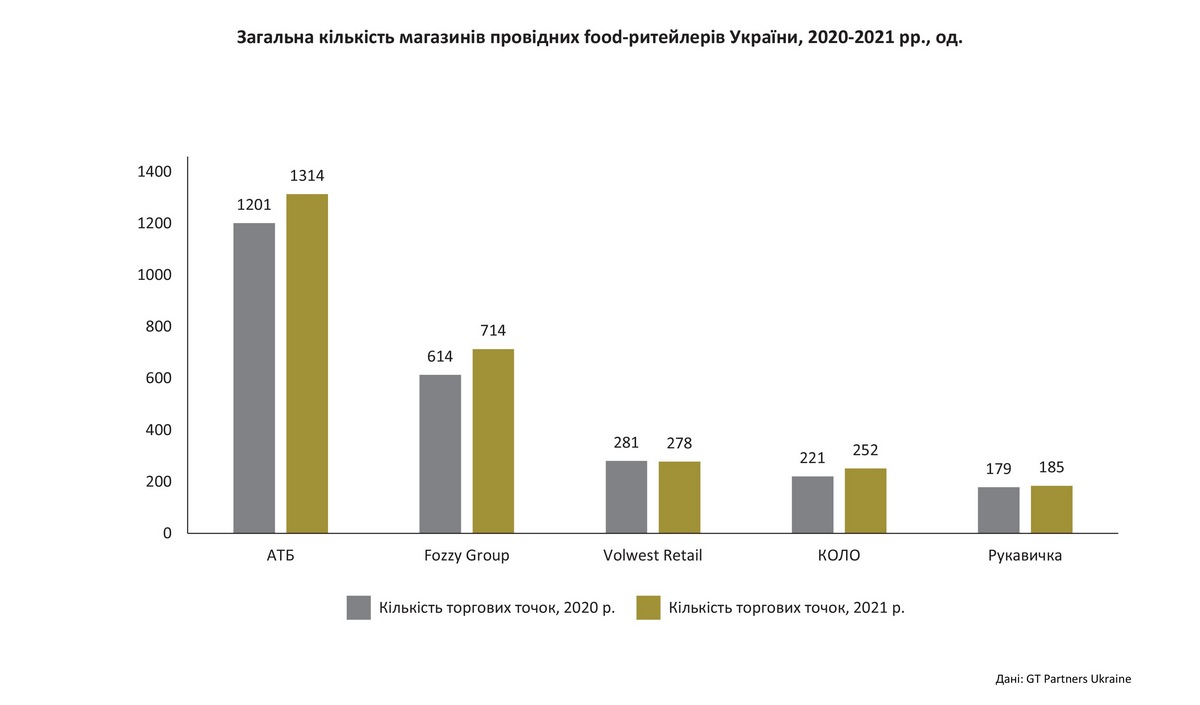 За даними аналітиків, перша п’ятірка рітейл-операторів України за загальною кількістю магазинів за рік не змінилася. Як і раніше, лідером за цим показником залишається мережа АТБ, яка станом на 31 грудня 2021 року вже налічувала 1314 магазинів (+9% у порівнянні з даними на кінець 2020 року).