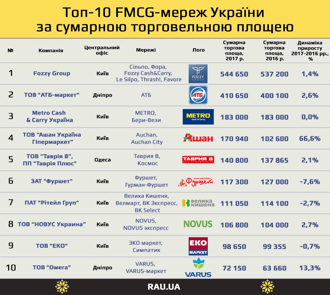 Топ-10 найбільших торговельних мереж України за сумарною торгівельною площею