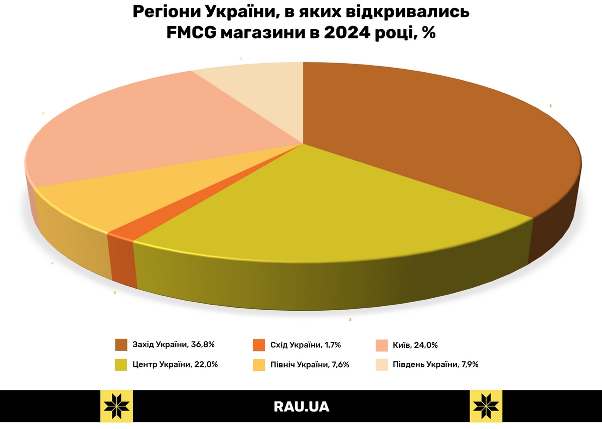Найгірша ситуація на сході країни, де в 2024 році відкрилося тільки шість нових магазинів з топ-10 мереж. Відповідно їх частка всього 1,7%.