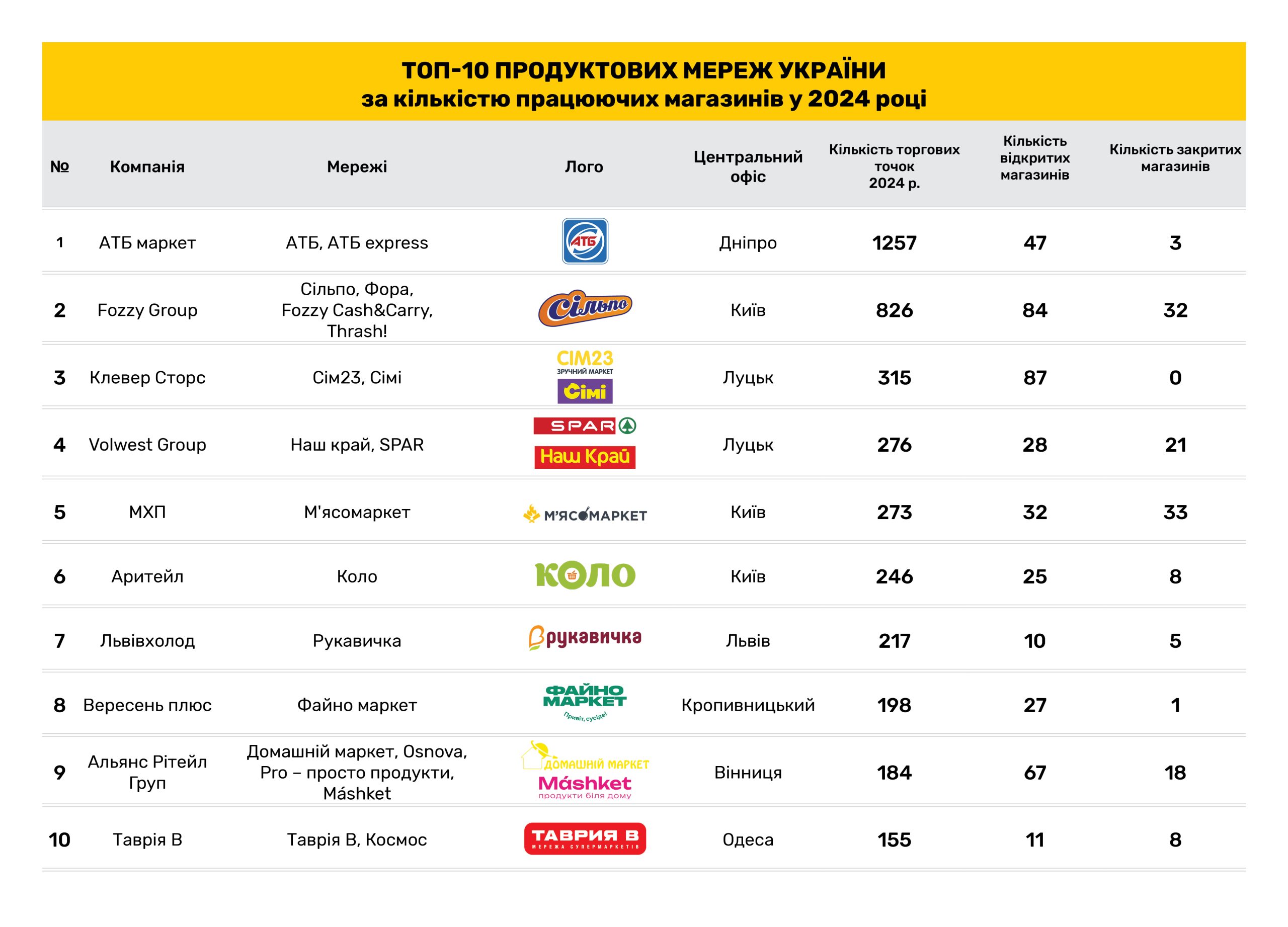 Топ-10 українських продуктових мереж за кількістю магазинів і темпами відкриттів у 2024 році