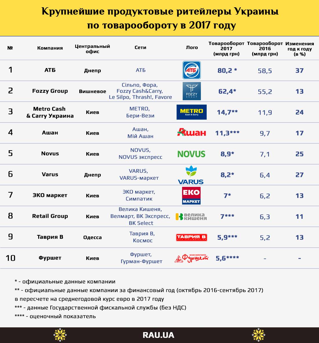 Втім, деякі рітейлери, що працюють в нашій країні, добровільно публікують або надають дані по товарообігу за минулий рік. Так роблять АТБ, Fozzy Group, Novus, Varus, ЕКО маркет. Але компанії не завжди уточнюють, чи мається на увазі виручка тільки роздрібного підрозділу групи, або всього холдингу в цілому. І не завжди – вказана виручка з ПДВ або без цього податку.
