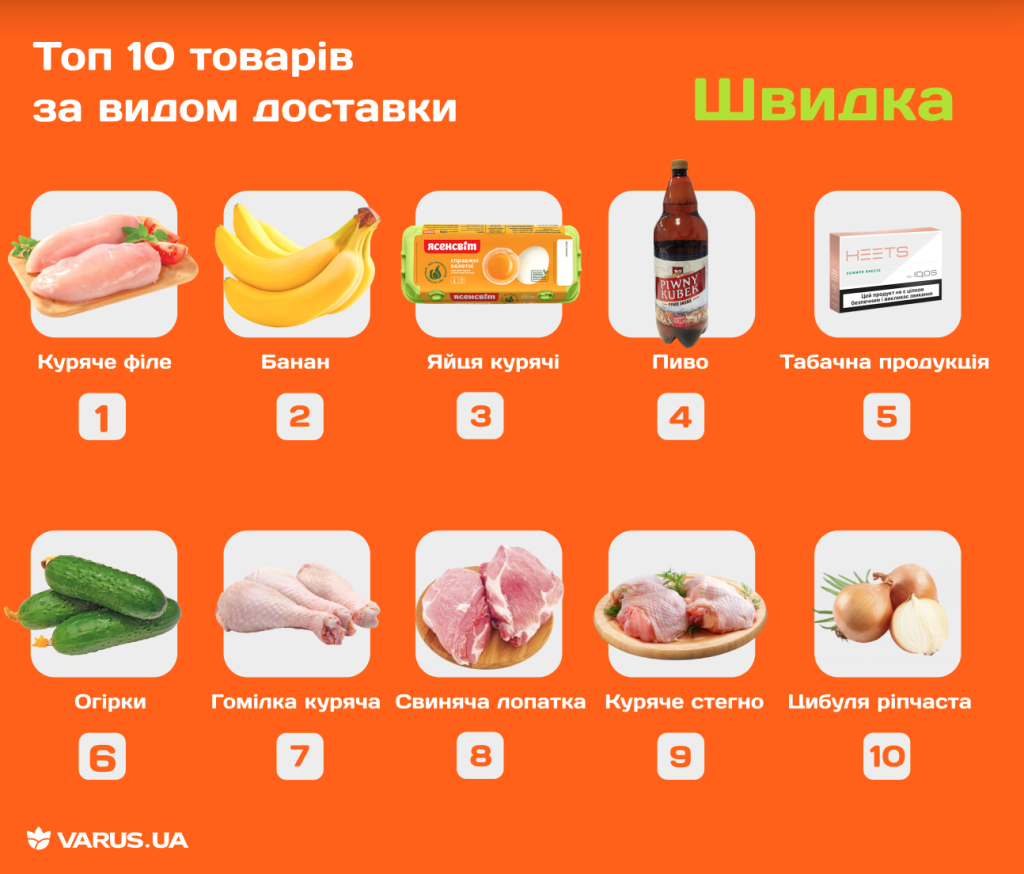 Під час замовлення планової доставки, українці найчастіше віддають перевагу курячому філе та яйцям. Також у топ-5 популярних товарів увійшли банани, ріпчаста цибуля та свиняча лопатка. Схожий перелік продуктів для себе складають і користувачі швидкої доставки. Топ-3 популярних товарів в цій категорії — філе курки, банани та яйця. А от наступні позиції в переліку відрізняються: у топ швидкої доставки також потрапили пиво, тютюнові вироби, огірки, курячі гомілки і стегна, свиняча лопатка та ріпчаста цибуля.