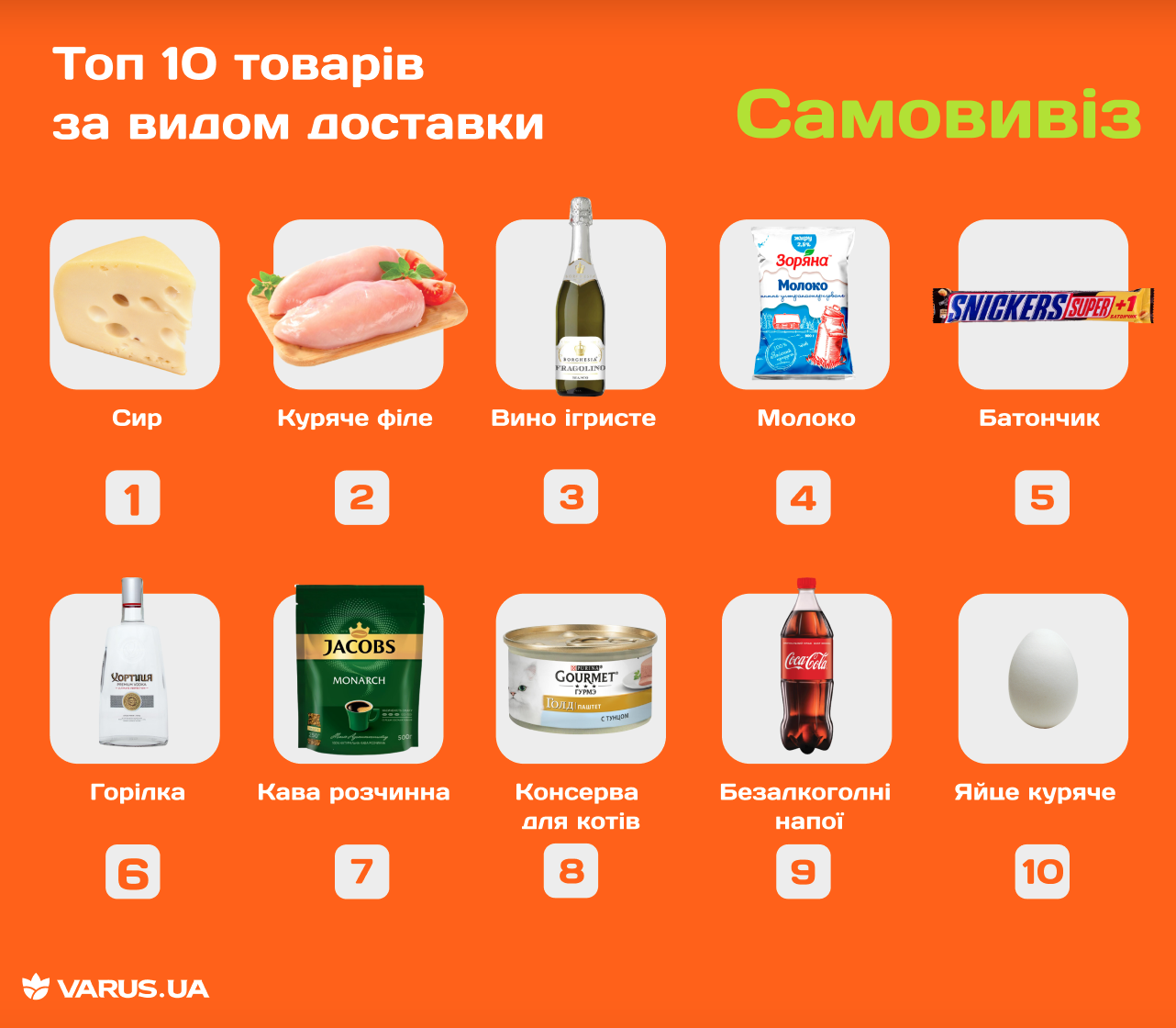 У категорії самовивозу перелік найпопулярніших товарів очолює сир. Шанувальники цього формату також часто додають до списку покупок куряче філе. А ще — ігристе вино, молоко, батончики Snickers, горілку та розчинну каву. Не забувають клієнти Varus і про домашніх улюбленців: у топ-10 покупок також входять консерви для котів.