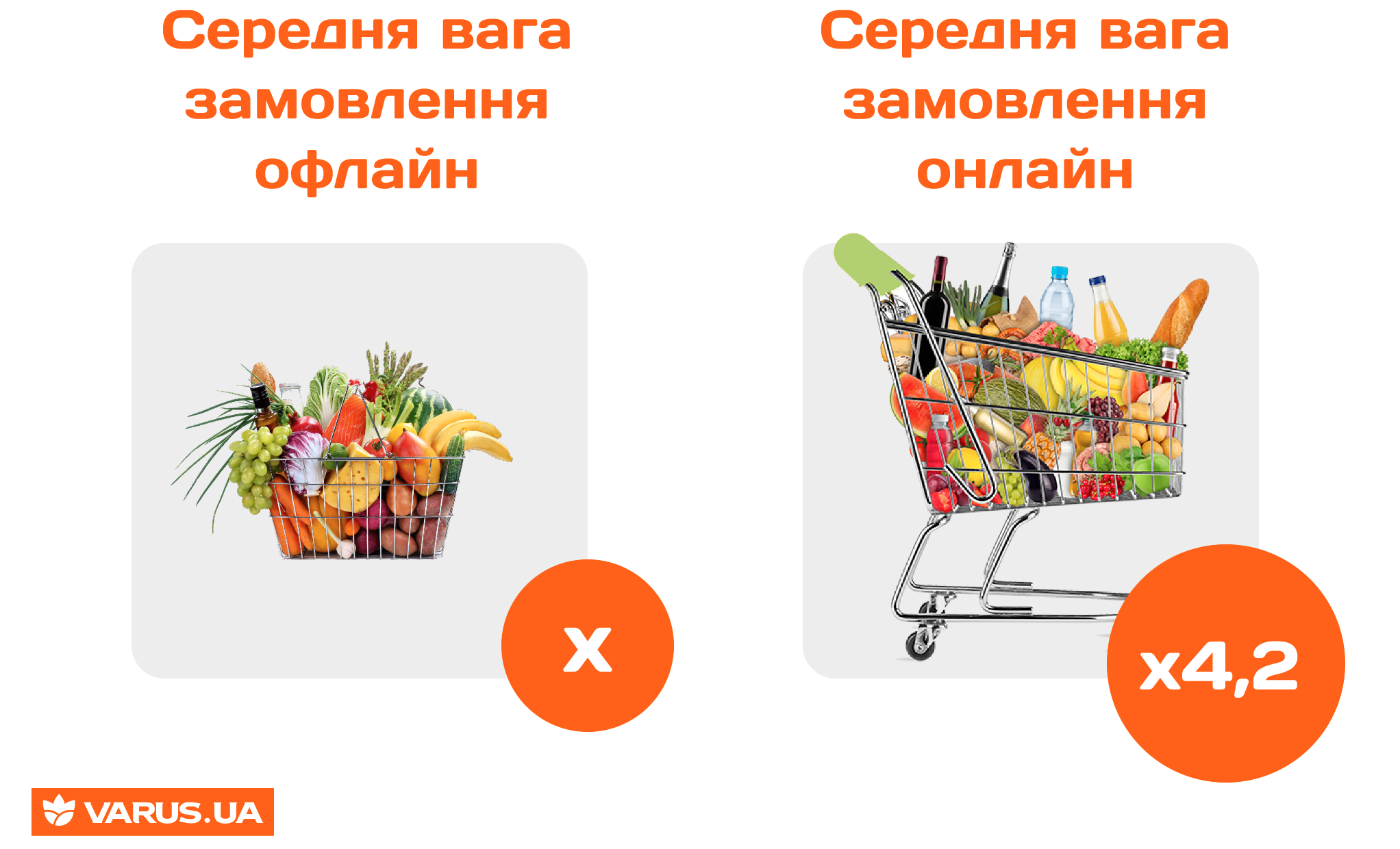 Середня вага покупок, які клієнт виносить із супермаркету Varus самостійно, дорівнює 6,38 кг. Онлайн-замовлення на сайті varus.ua в середньому важить у 4,2 рази більше — 26,5 кг. “Погодьтесь, дуже зручно, коли вам привозять все необхідне під двері дому і не потрібно нести важкі пакети самостійно. Користувачі онлайн-покупок мають унікальну можливість обирати з широкого асортименту товарів, не виходячи із дому”, – говорять в мережі.