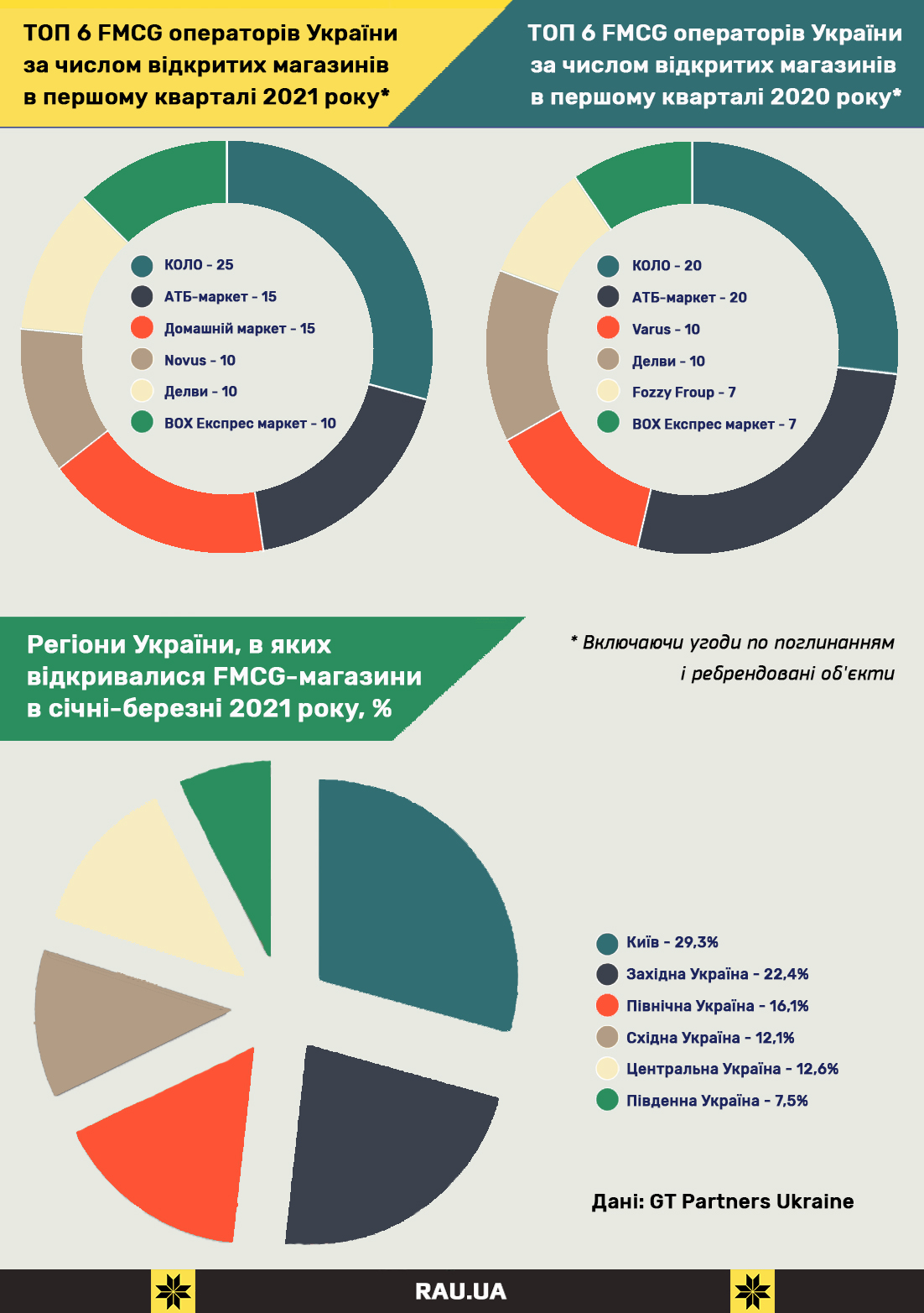 Дослідницька компанія GT Partners Ukraine представила своє чергове дослідження «Топ-175 торгових операторів FMCG України за кількістю магазинів, I квартал 2021-го». У звіті експерти проаналізували: хто з рітейлерів і де відкриває нові торгові точки, які формати магазинів найбільш популярні, на що робить ставку той чи інший гравець національного чи регіонального масштабу.