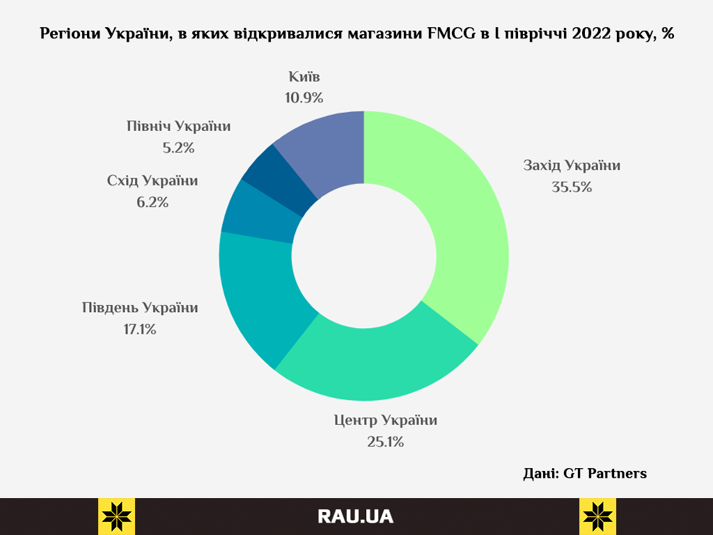 Найбільші зміни відбулися у регіональному розрізі, оскільки рітейлери, як і багато інших бізнесів, перенесли основні свої зусилля на захід України. Тому не дивно, що на долю Волинської, Рівненської, Тернопільської, Львівської, Івано-Франківської, Хмельницької, Чернівецької, Закарпатської областей у першому півріччі 2022 року прийшлося 35,5% нових відкриттів. Але варто відзначити, що цей тренд руху на Захід був помітним іще й у мирний час, але рік тому цей показник не перевищував 25%. Натомість на долю столиці з її околицями прийшлося лише 10,9% замість колишніх 24,8%.