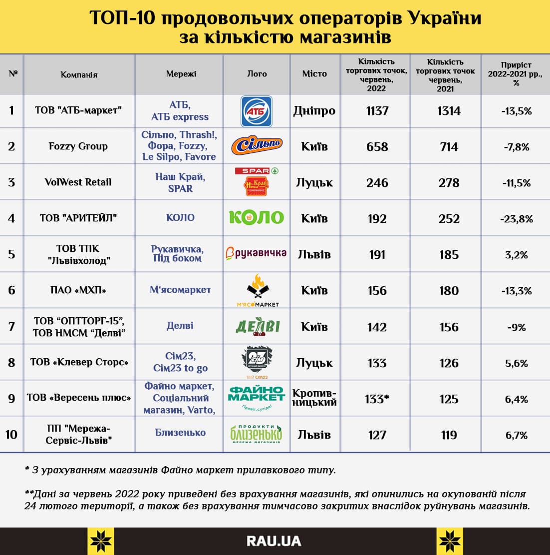 Проте, за даними аналітиків, незважаючи на серйозні втрати, які понесли мережі там, де велися та продовжуються активні бойові дії, в тому числі на окупованих територіях, перша десятка FMCG-операторів України за загальною кількістю магазинів майже не зазнала змін. Це пояснюється запасом міцності національних операторів та великою кількістю торгових точок у мереж, що дозволило лідерам далеко відірватися від конкурентів.
