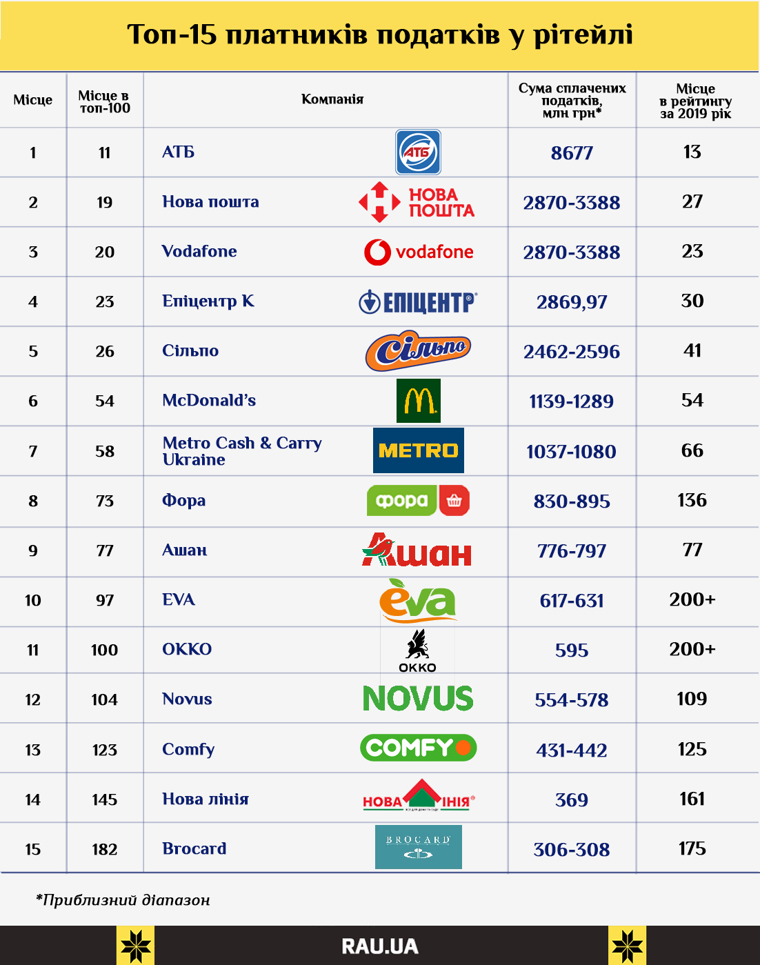 В першу десятку платників традиційно входять підприємства нафтогазової та енергетичної сфер, виробники тютюну, держмонополії, такі як Укрзалізниця. Але вже на 11-му місці знаходиться найбільша мережа продовольчого рітейлу – АТБ. Лідер серед рітейлерів за розміром сплачених податків перерахував до бюджету майже 8,68 млрд грн. Його вклад в бюджети всіх рівнів за рік виріс на 28% в порівнянні з показником 2019 року. Це дозволило мережі потіснити в рейтингу державний Приватбанк і піднятися за рік відразу на дві позиції: з 13-го на 11-е місце.