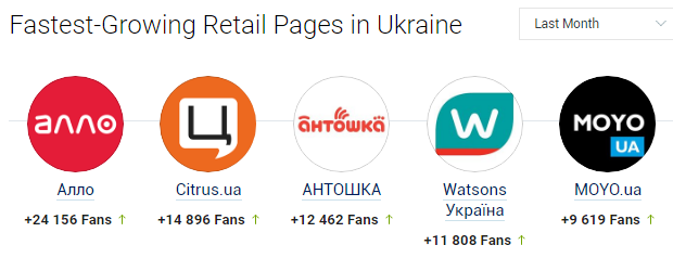 Згідно з даними аналітичного сервісу Socialbakers, у листопаді український рітейл не став зменшувати темпи зростання минулих місяців і поставив нові рекорди. Якщо у вересні найбільш швидко зростаючим став Антошка, отримавши 21 000 нових шанувальників, то минулого місяця його обійшов Алло, який також обмінявся з українською мережею товарів для дітей місцями в топі. Між ними знову розмістився Цитрус, не зраджуючи собі в постійних +15 000 нових фоловерів. За ними слідує такий же здатний похвалитися своєю постійністю в прагненні до зростання Watsons і MOYO, який увірвався також в 20-ку сторінок за кількістю шанувальників.