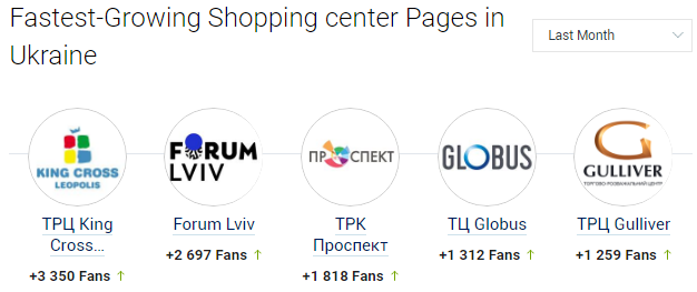 Ще одним героєм листопада стає King Cross Leopolis, який пробрався з 12 рядка рейтингу на 10-тий, що заслуговує окремої уваги, адже позаду залишилися такі лідери топа, як DreamTown і Аракс. Створюється враження, що мешканці Львова нарешті залишили всі інші соціальні мережі і стали масово мігрувати в Facebook, не забуваючи поставити заслужений лайк одному з трьох торгово-розважальних центрів столиці Галичини та Західної України. ТРЦ інших регіонів і їх аудиторія ніби застрягли десь в Контакті, не бажаючи відмовлятись від уже не актуальних трендів нульових.