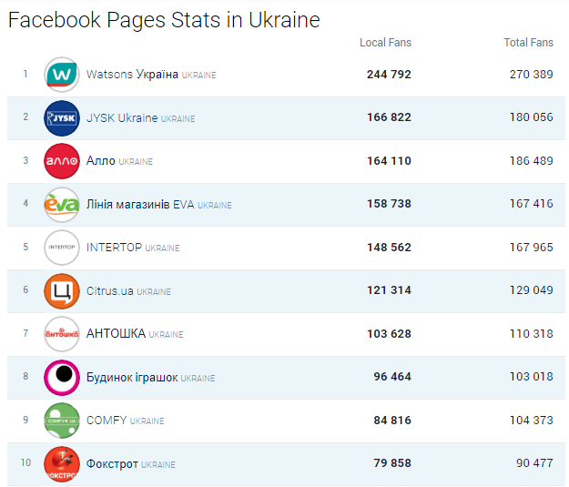Топ-20 Facebook-сторінок українських рітейлерів і ТРЦ за листопад