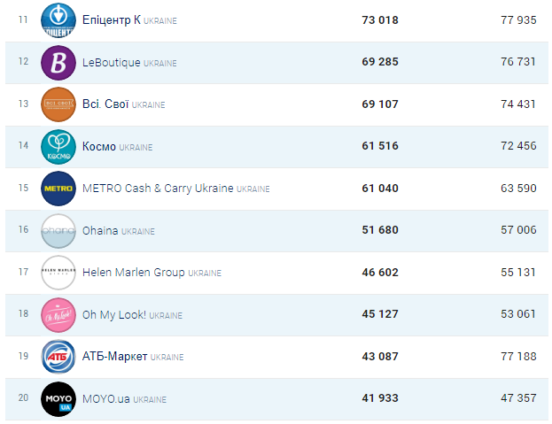 АТБ-маркет в цьому місяці зменшив свої апетити і поки зупинився на 19-му місці, як втім і Епіцентр та Космо, що зберегли свої 11-ю і 14-ю позицію. Місцями помінялися Всі.Свої і LeBoutique. Прогнозувати попадання в топ-10 на фінал року вже не доводиться.