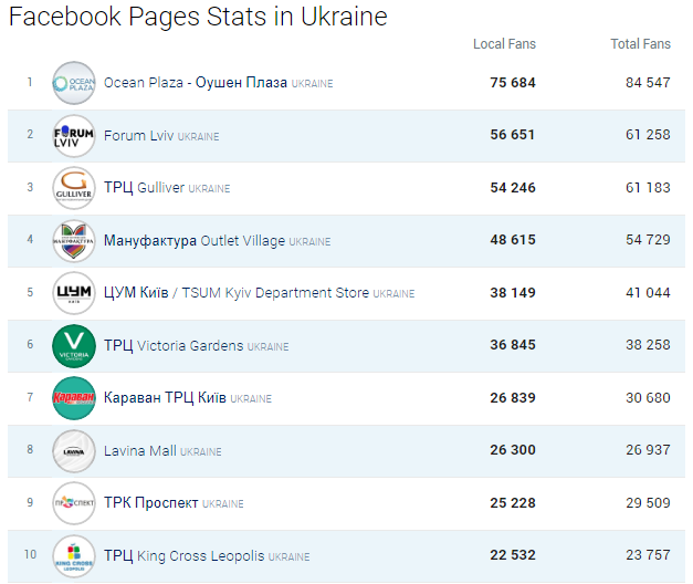 Першість в основного рейтингу серед торгових центрів за кількістю шанувальників у Facebook, згідно з даними аналітичного сервісу Socialbakers, як і раніше займає ТРЦ Ocean Plaza. Слідом за ним йдуть вже згадані Forum Lviv і Gulliver і київське аутлет-містечко Мануфактура, яке все ще не варто скидати з рахунків і можна очікувати його в сутичці за позиції в топ-3 кращих. Агресивна онлайн-стратегія, подібно до тієї, за яку взялися окремі топові українські рітейлери, і Facebook-переворот в рейтингу забезпечений.