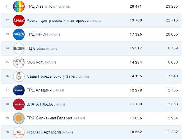 У топ-5 раптово забрався ТЦ Globus, витіснивши звідти РайON, і тепер з такими темпами можна говорити про досить серйозні амбіції столичного торгового центру в 20-ці лідерів, але про це нижче.