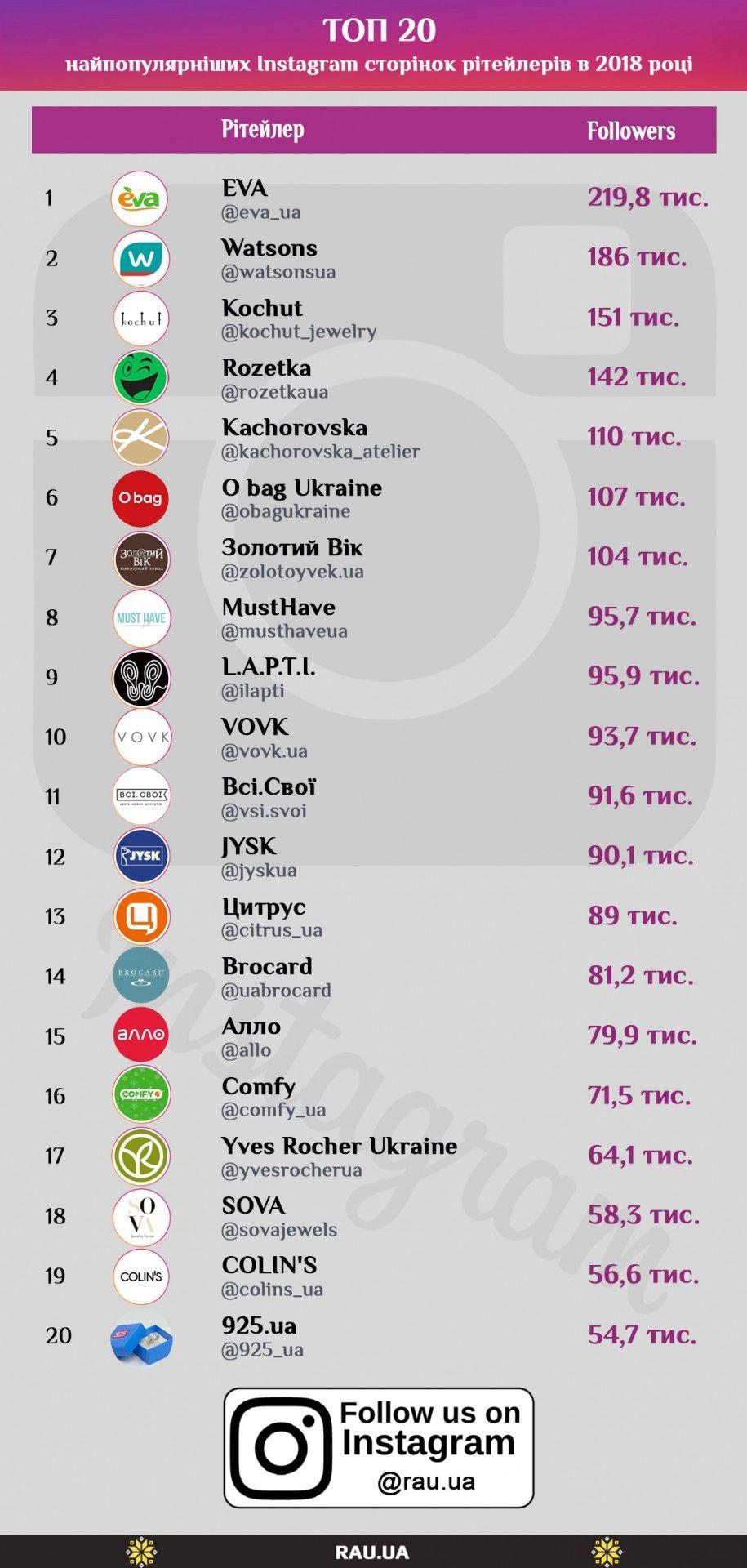Очолили рейтинг drogerie-гравці – EVA і Watsons, які успішно закріпилися в трійці лідерів за кількістю фоловерів і в Facebook. Але на цьому спільне з Facebook-рейтингом закінчується. За ними розмістилися ювелірний бренд Kochut і Rozetka, яка хоч десь поступилася несподіваним конкурентам. Далі перша десятка виглядає абсолютно непередбачувано (принаймні для тих, хто не стежить за розвитком рітейлу в Instagram): місця віддані на відкуп українським виробникам Kachorovska, MustHave, LAPTI, VOVK і Всі.Свої, потіснити яких з офлайн-гігантів зміг хіба що Золотий Вік.