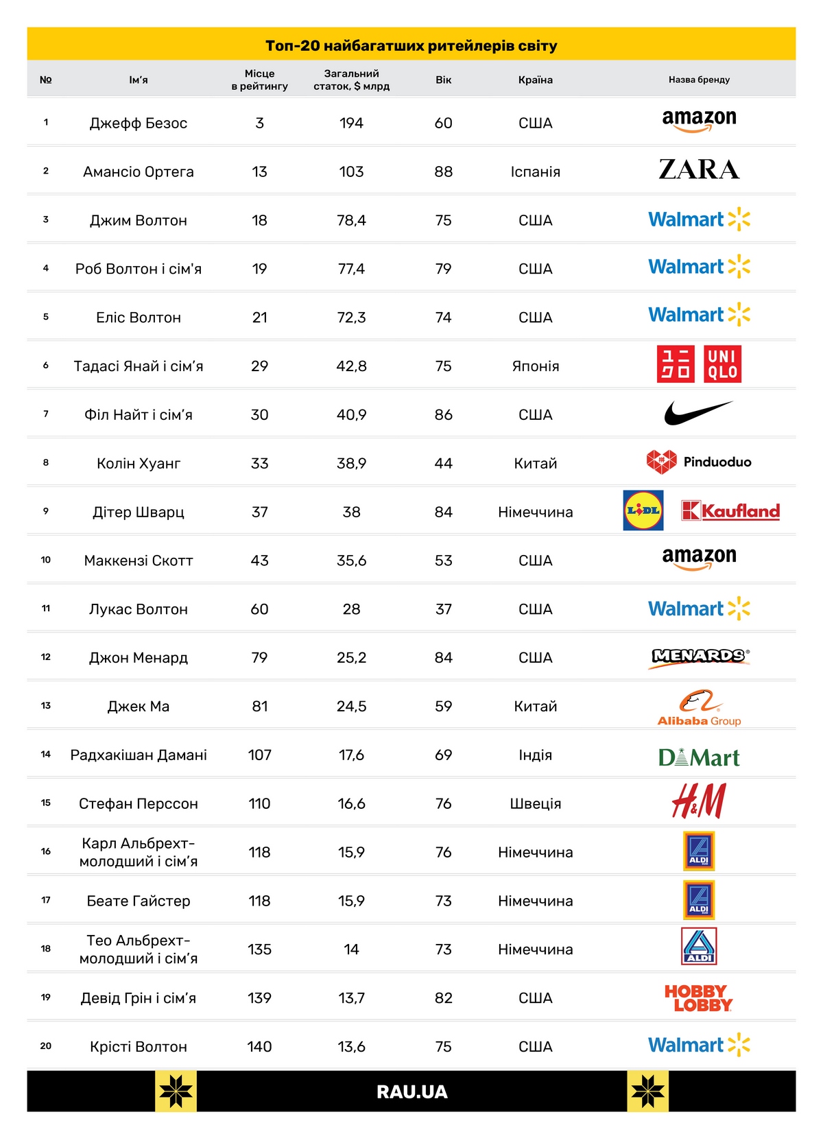 Сполучені Штати, як і раніше, можуть похвалитися найбільшою кількістю мільярдерів, в тому числі в сфері ритейлу. Так, із 20 найбагатших ритейлерів світу (зі статком більше $13 млрд) половина – це громадяни США. Але багато з них є співвласниками одного спільного бізнесу. Також другий рік поспіль список найбагатших людей світу очолює громадянин Франції – керівник групи LVMH (Christian Dior, Louis Vuitton, Tiffany & Co та інші) Бернар Арно, який ще минулого року потіснив Ілона Маска на друге місце рейтингу ультрабагатіїв.