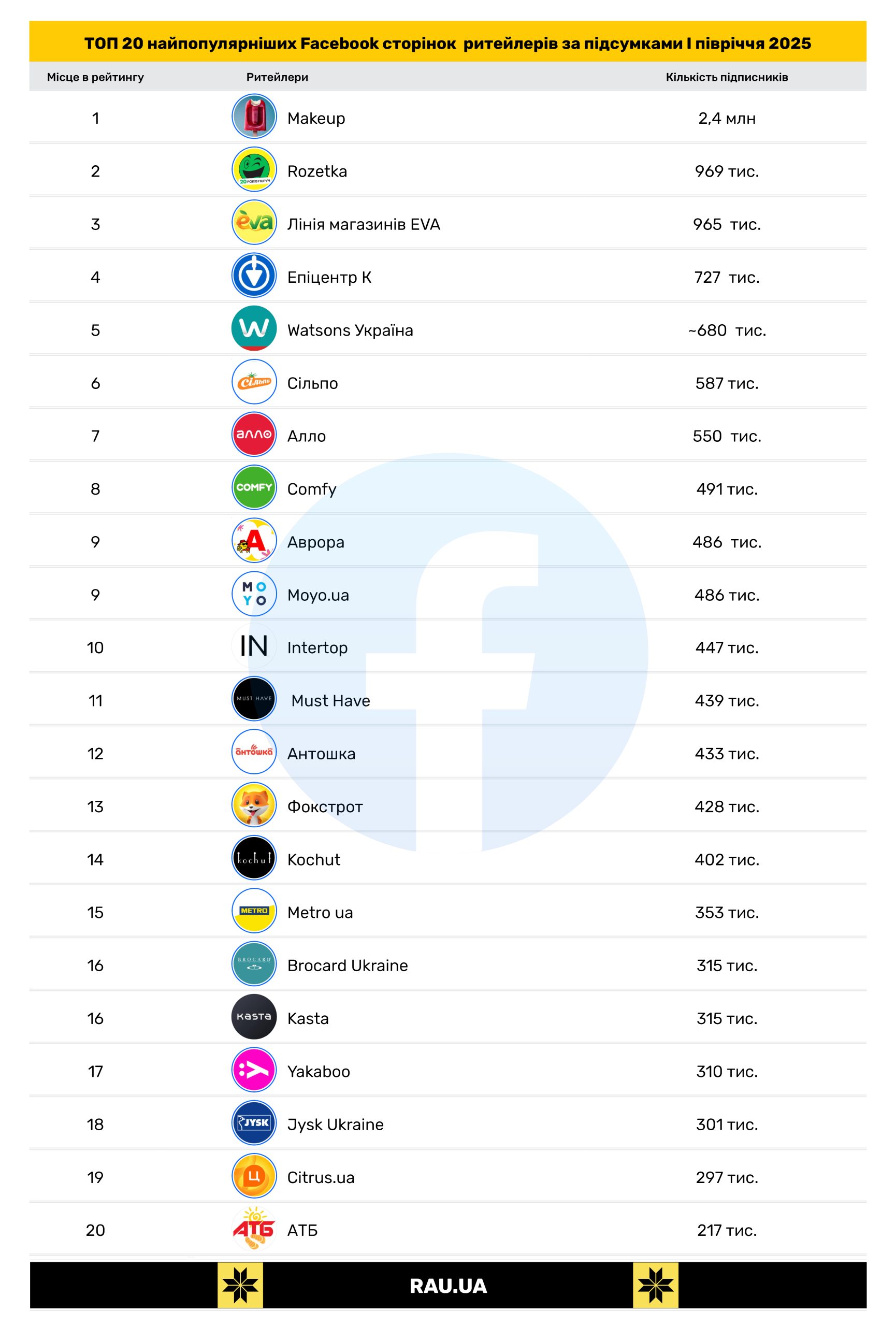 У І півріччі 2025 року рейтинг найпопулярніших Facebook-сторінок ритейлерів в Україні зазнав певних змін. Деякі гравці суттєво наростили аудиторію, інші — втратили позиції. RAU проаналізував динаміку, порівнявши свіжі дані з підсумками І кварталу.