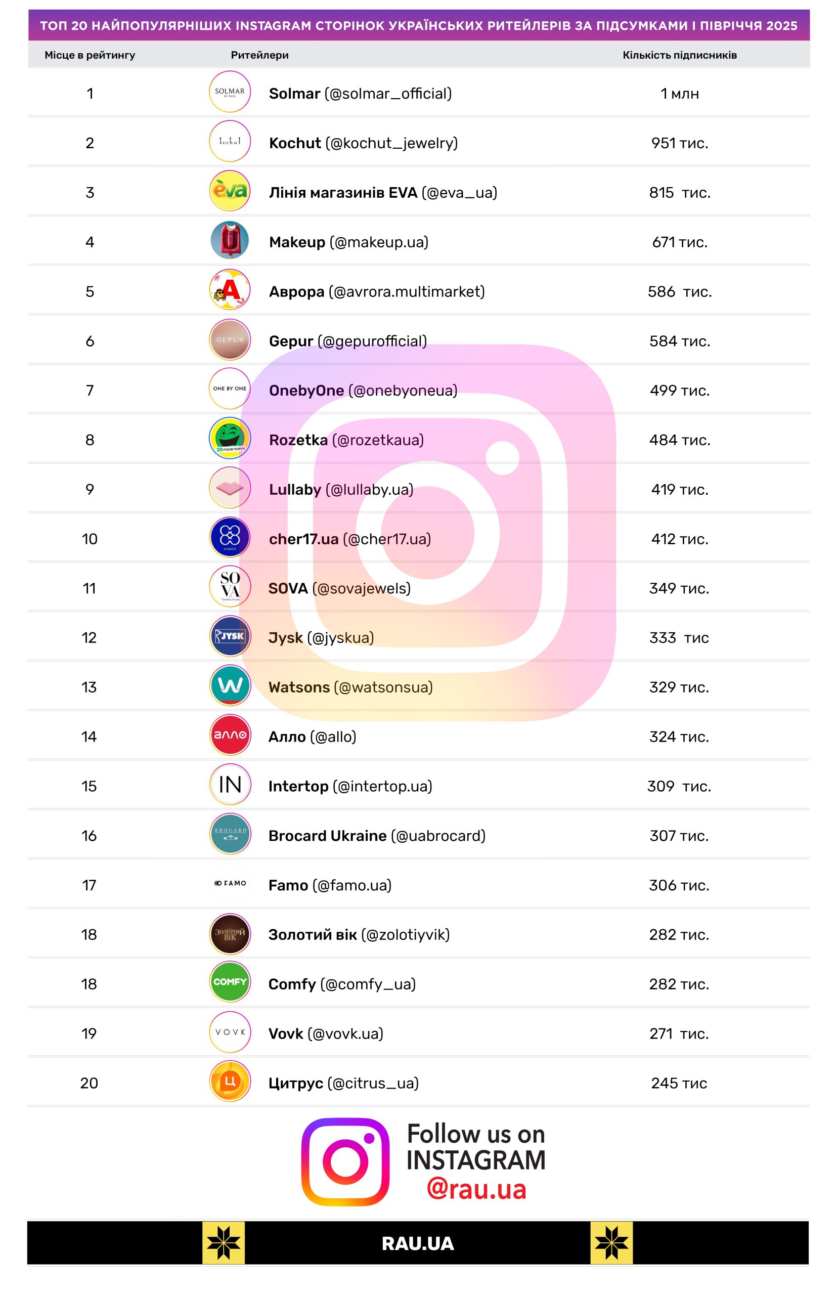 За результатами І півріччя 2025 року топ-20 українських ритейлерів у Instagram зазнав лише точкових змін. Деякі сторінки втратили динаміку, інші — впевнено наростили аудиторію. Загалом, Instagram залишається майданчиком, де beauty-, fashion- і lifestyle-бренди домінують, але частка ритейлерів із сектору електроніки та товарів для дому поступово зростає.