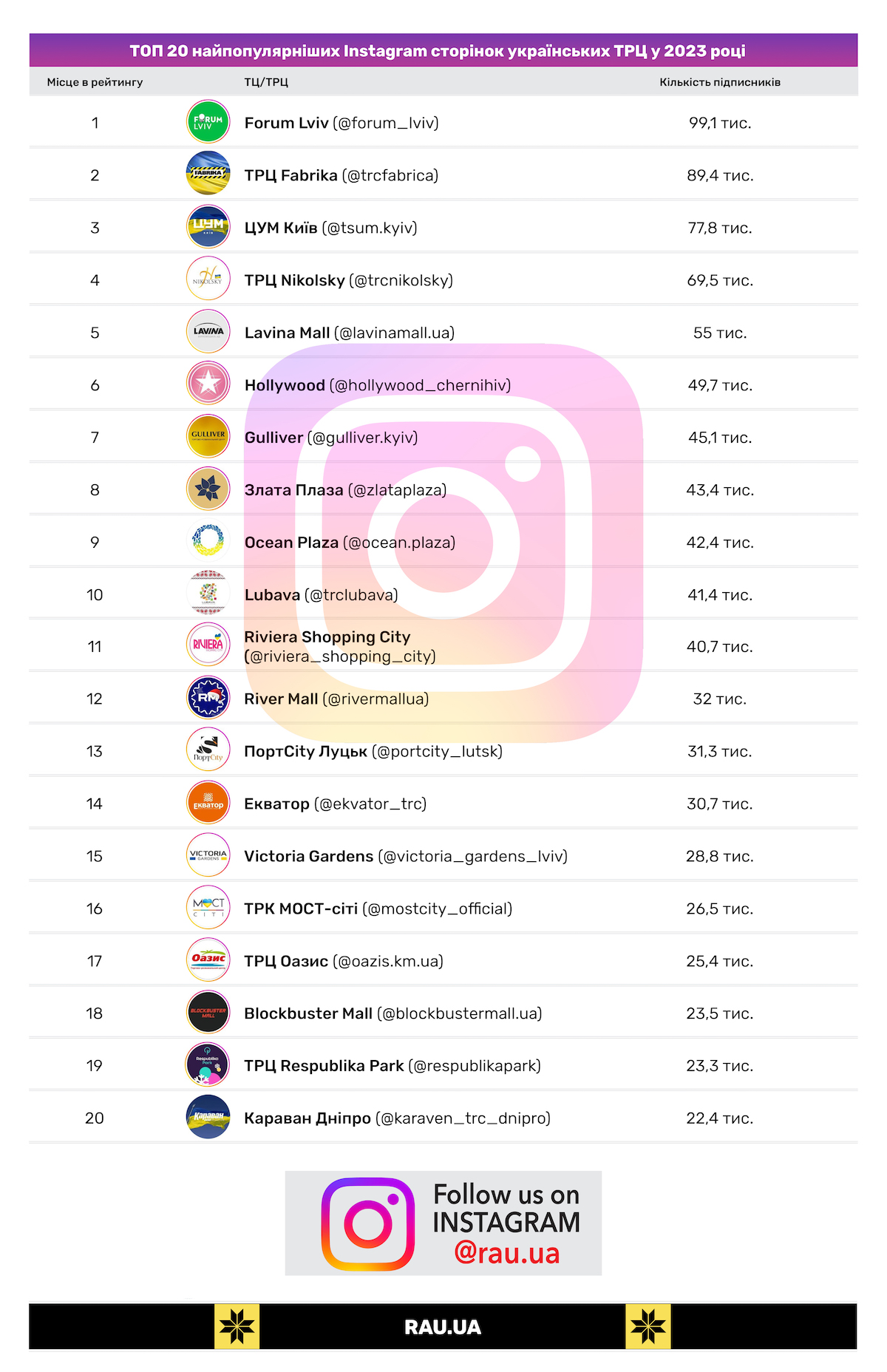 Передостаннє місце рейтингу зайняв ТРЦ РайON p 34 000 фоловерів. А от останнє 20 місце цього разу обійняв ТРЦ Караван Дніпро, який є новачком рейтингу.